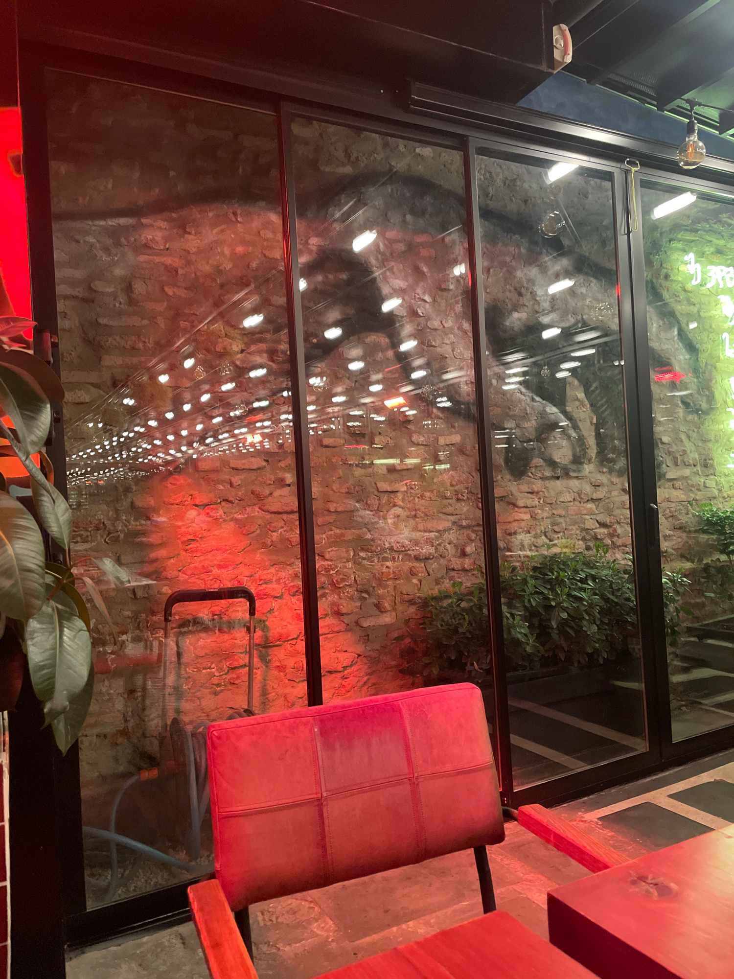 The image shows an interior view through a glass window in what appears to be a commercial or residential space. Outside, there is a brick wall illuminated with a string of lights leading into the disβ¦read more