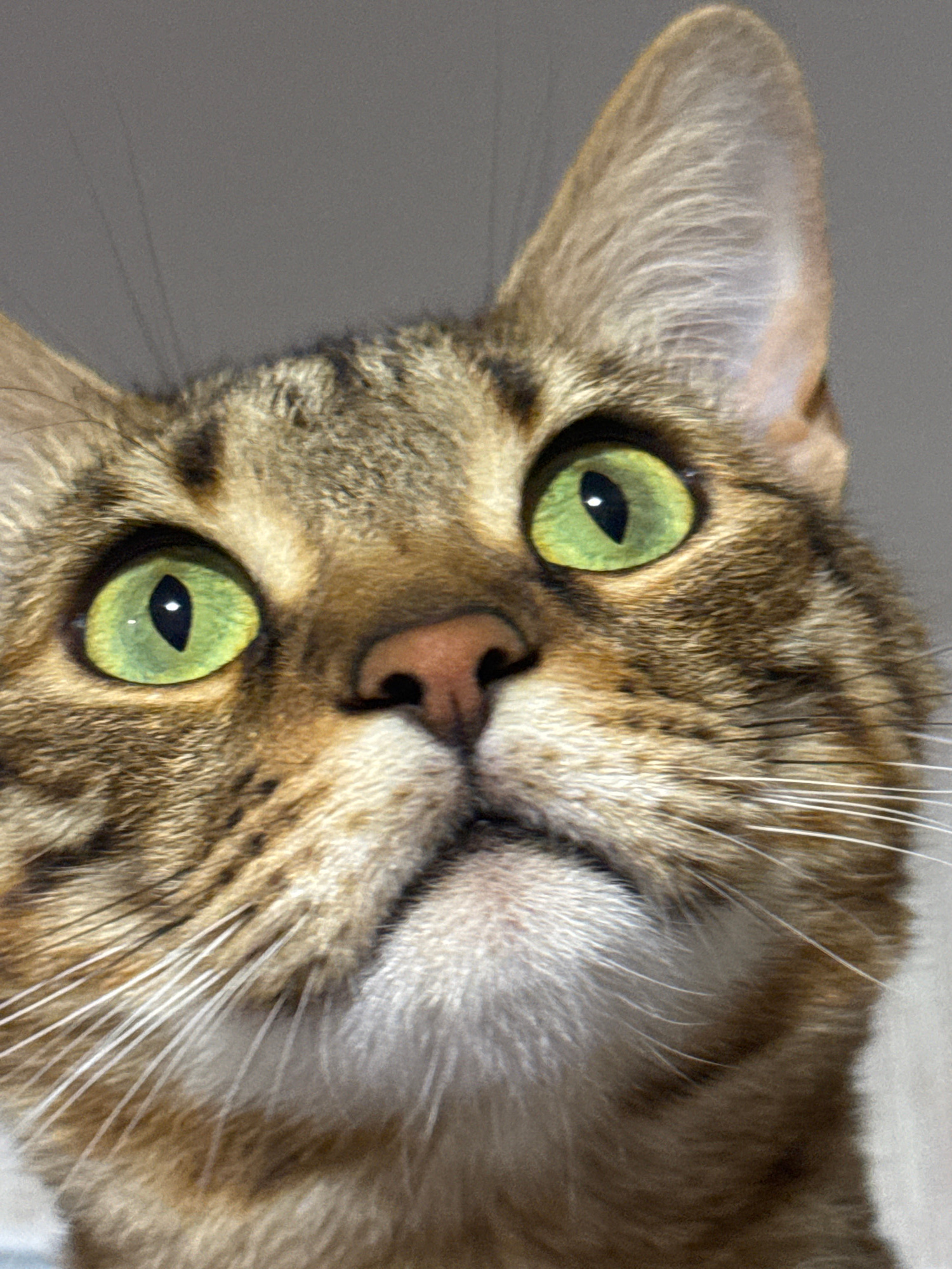 The image shows a close-up view of a tabby cat's face, tilted at an angle. The cat has green eyes with slit pupils and a pink nose. Its fur is brown and tan with distinct markings. The environment is…read more