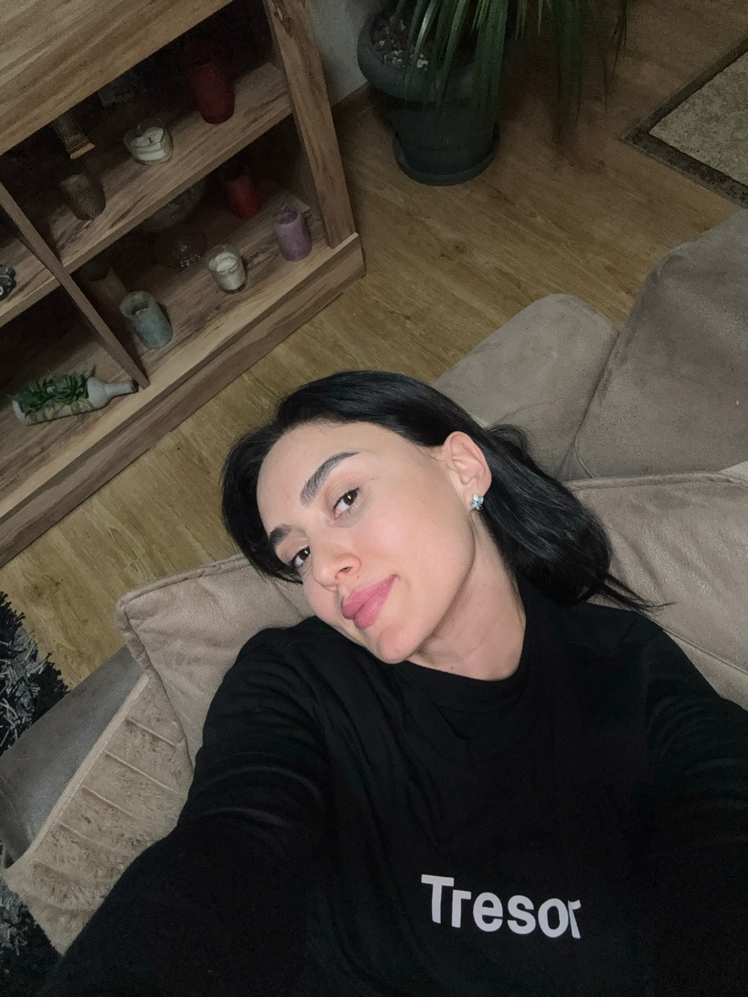 A person is lying on a light brown upholstered couch. The person has dark hair and is wearing a black shirt with white lettering, part of which reads "Treso". The person is facing the camera with thei…read more
