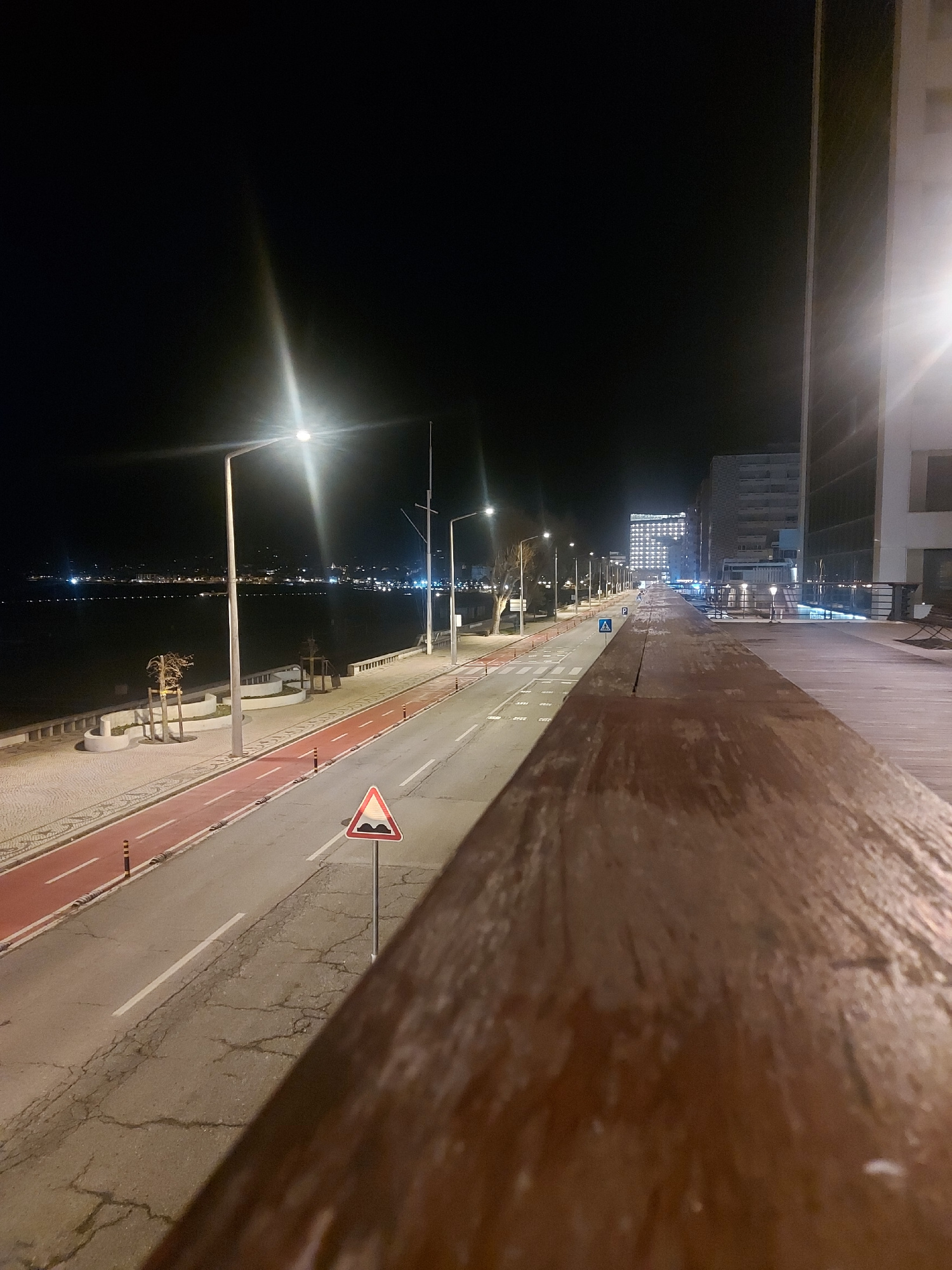 The image shows an elevated view of a street in Figueira da Foz, Portugal, at night. A wooden railing is visible in the foreground. A street with a designated bike lane is illuminated by streetlights.…read more