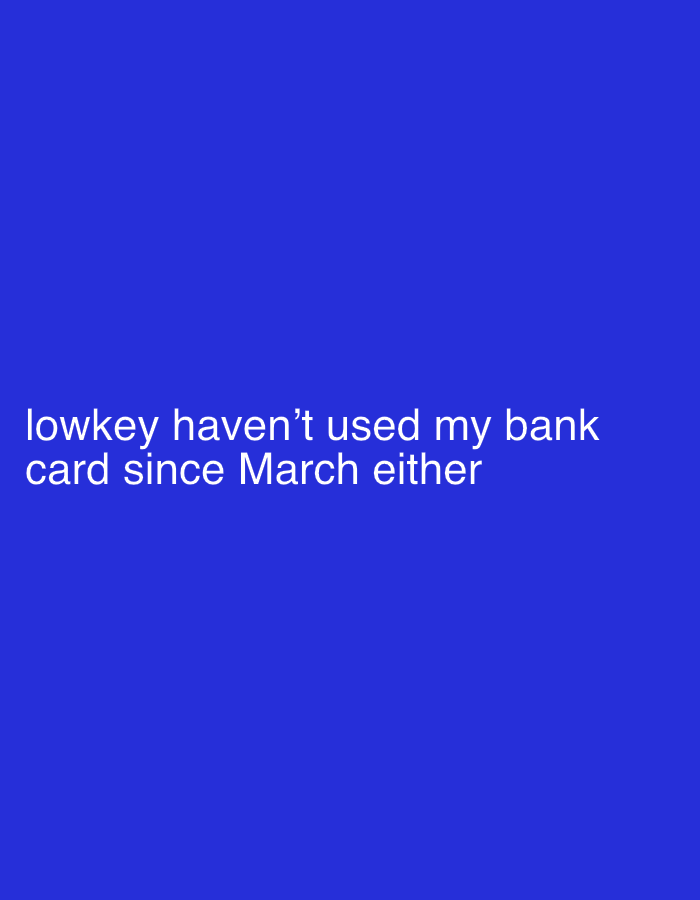 A digital image displays white text reading "lowkey haven't used my bank card since March either" against a solid dark blue background. The text is positioned centrally in the lower half of the frame.…read more