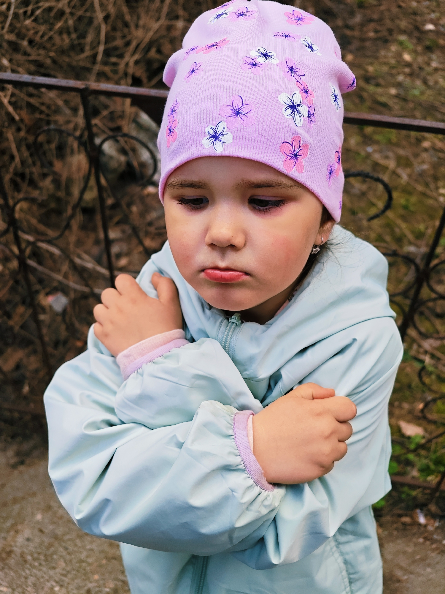 A young girl, standing outdoors in Chaikovsky, Russia, is seen from an elevated perspective. She wears a light blue jacket and a lilac-colored hat with a floral pattern. She crosses her arms tightly a…read more
