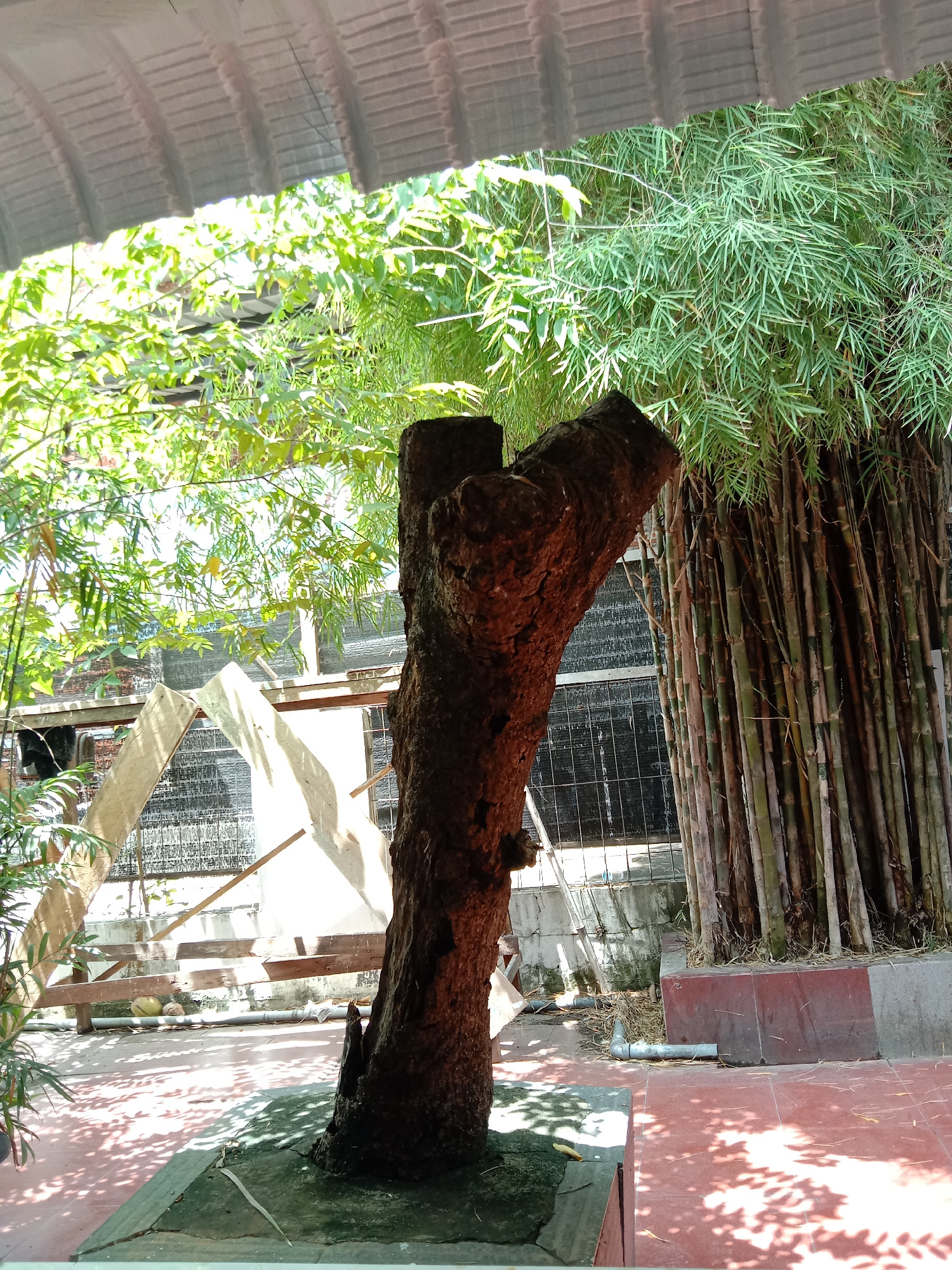 The image depicts an outdoor scene in Lhokseumawe, Indonesia, featuring a dark, trimmed tree trunk in the foreground. Behind the trunk, a dense stand of bamboo shoots grows in a raised planter bed. In…read more