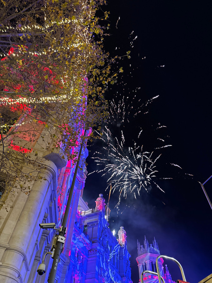 Fireworks explode in the dark night sky above a brightly illuminated building. The building is adorned with intricate architectural details and bathed in blue and red light. In the foreground, a tree…read more