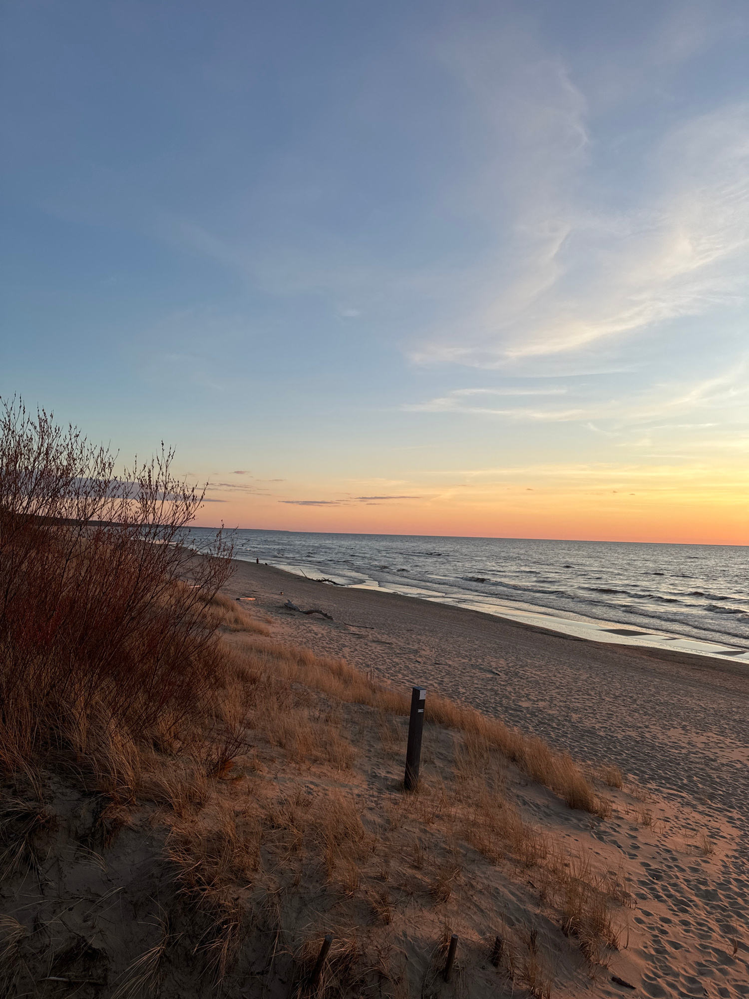 The image depicts a landscape in Carnikava, Latvia, showcasing a beach at sunset. The scene is divided vertically: on the left is a pale blue sky with thin, wispy clouds, transitioning to a gradient o…read more