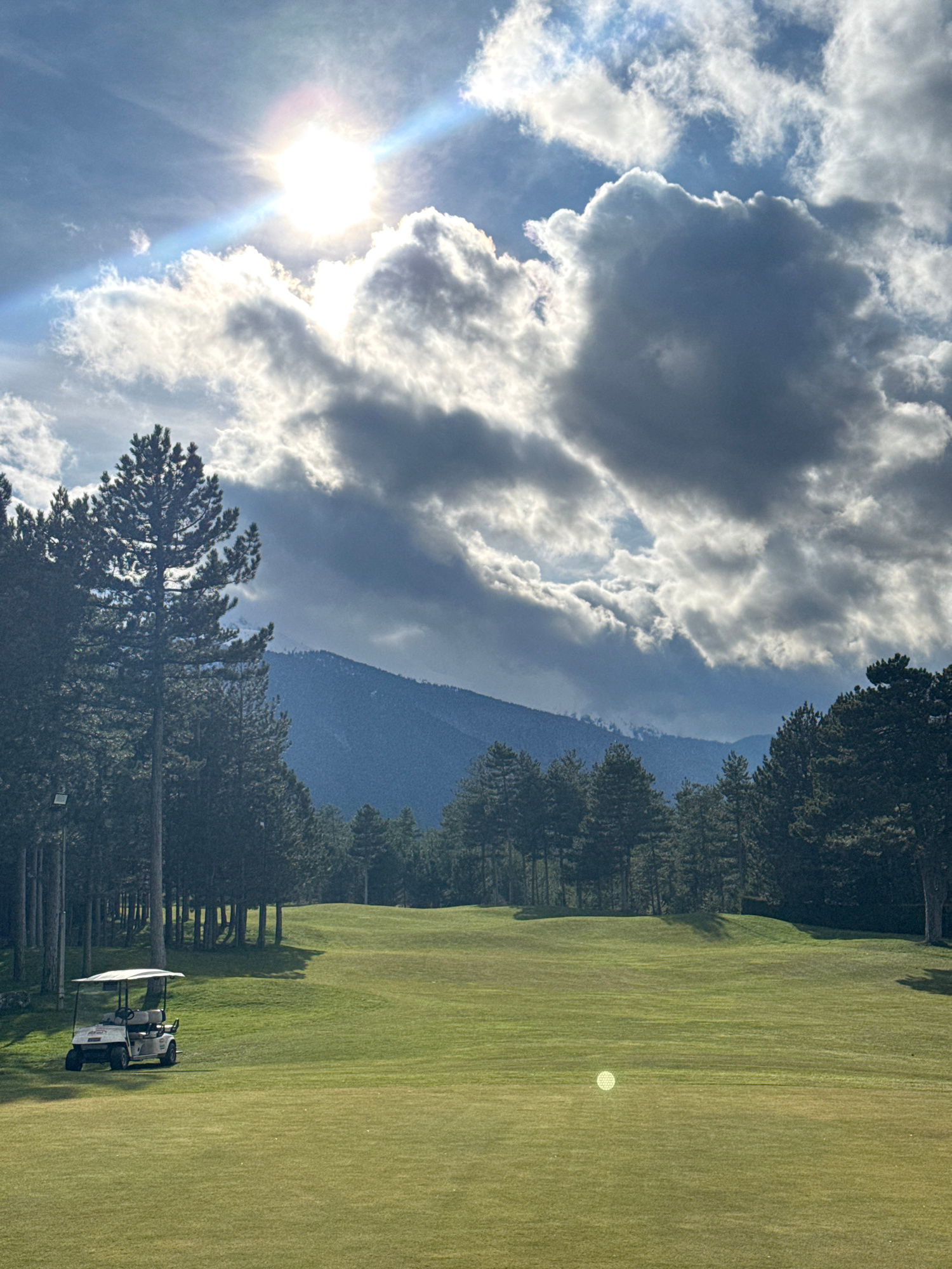 The image depicts a golf course, presumably in the Razlog area of Bulgaria, characterized by a bright sky with scattered clouds and a visible sun flare. Tall trees line the left side of the frame, bor…read more