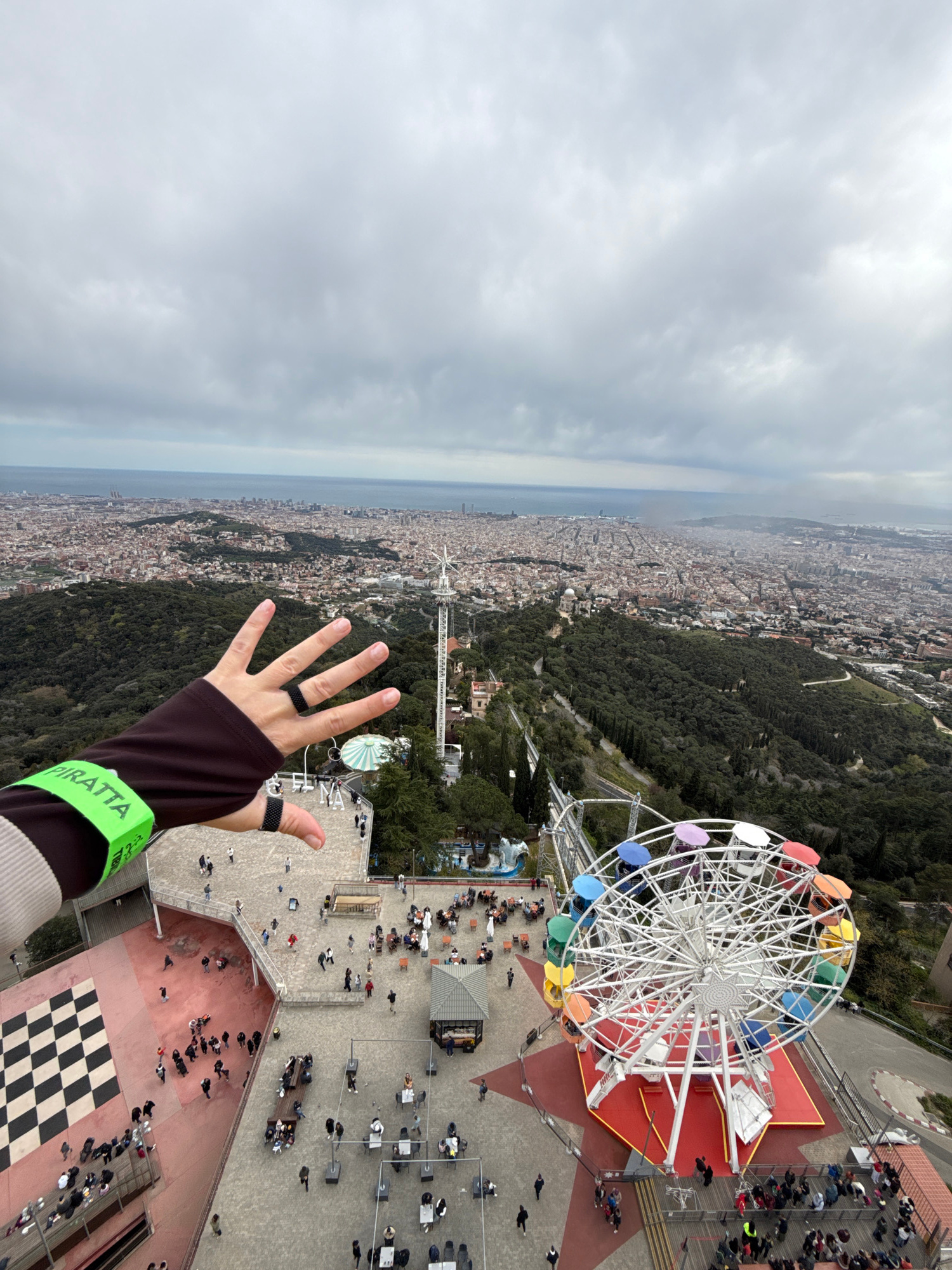A vertically-oriented, high-angle photograph reveals a scenic overlook in Barcelona, Spain, likely taken from Tibidabo Mountain, offering panoramic views. The skyline of Barcelona stretches to the hor…read more