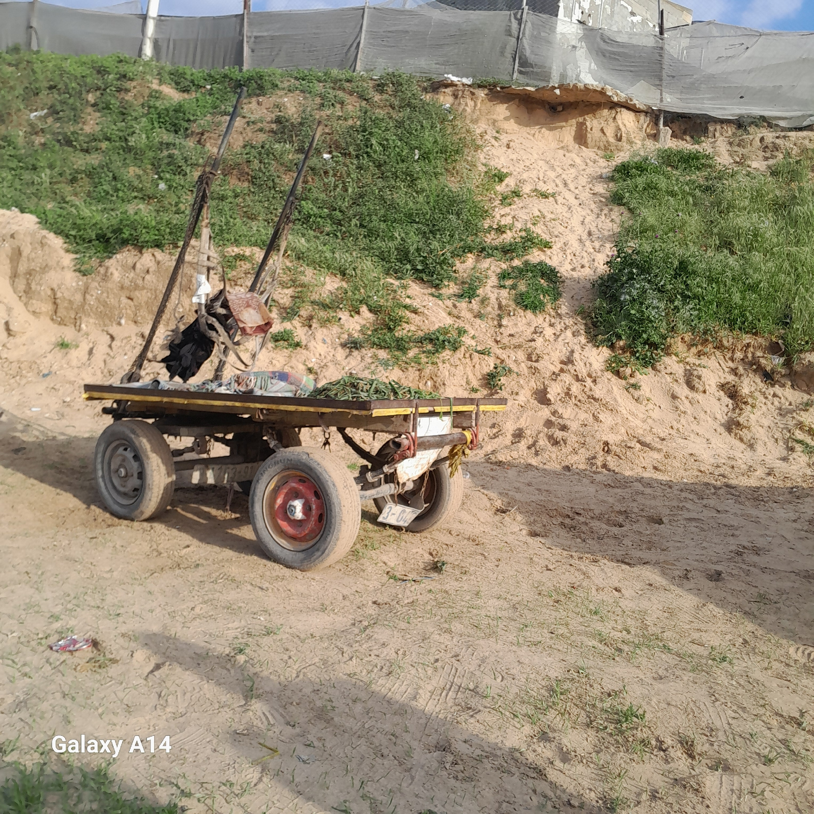 The image displays an outdoor scene in Khan Yunis, Palestinian Territory, under clear daylight. A four-wheeled utility cart with a wooden bed and yellow trim is centrally positioned on an unpaved, san…read more