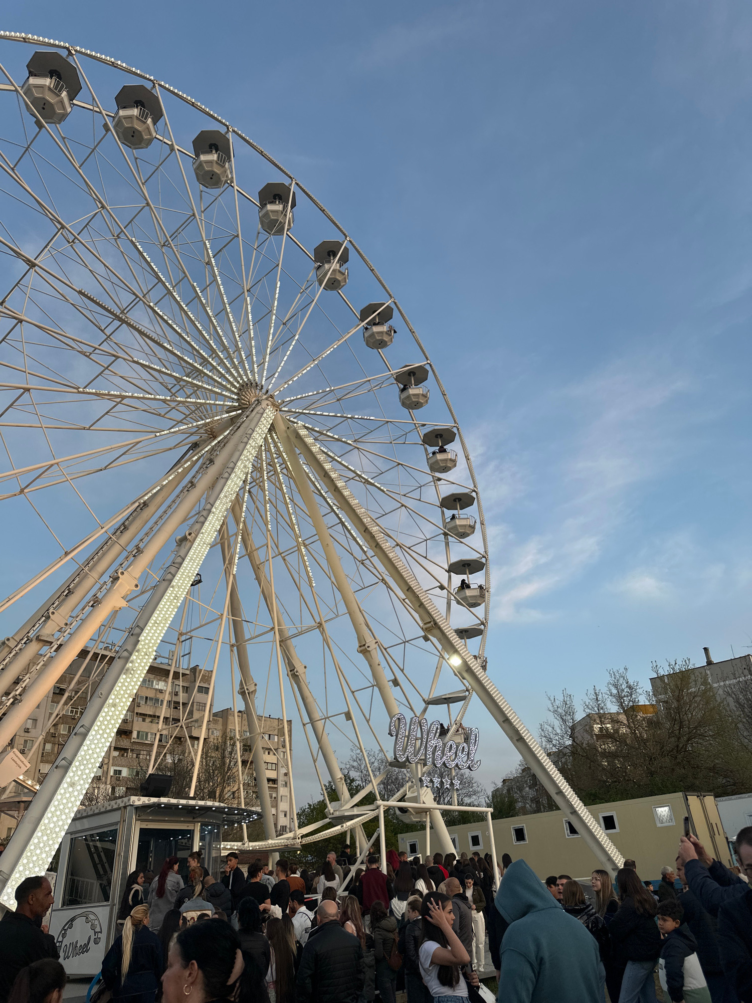 The image shows a large Ferris wheel in Plovdiv, Bulgaria, likely a temporary installation. The wheel is white with enclosed passenger cars and LED lights along the spokes. A dense crowd of people sta…read more