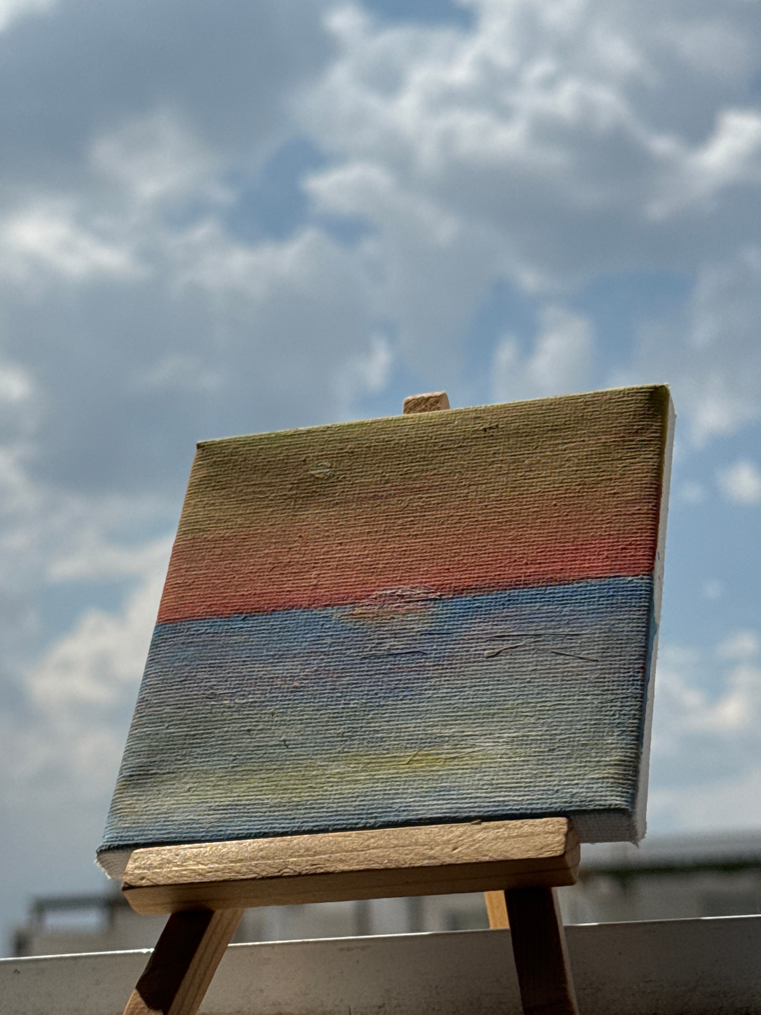 A small, square canvas painting rests on a miniature wooden easel outdoors. The painting features three vertical bands of color: from left to right, a muted yellow-brown, a reddish-orange, and a grayi…read more