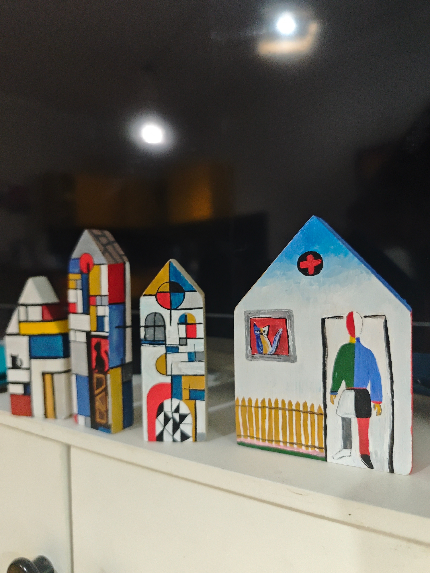 Four painted wooden house-shaped figurines stand on a white surface. The first three are decorated in a style reminiscent of Piet Mondrian, with geometric shapes in red, blue, yellow, white, gray, andβ¦read more