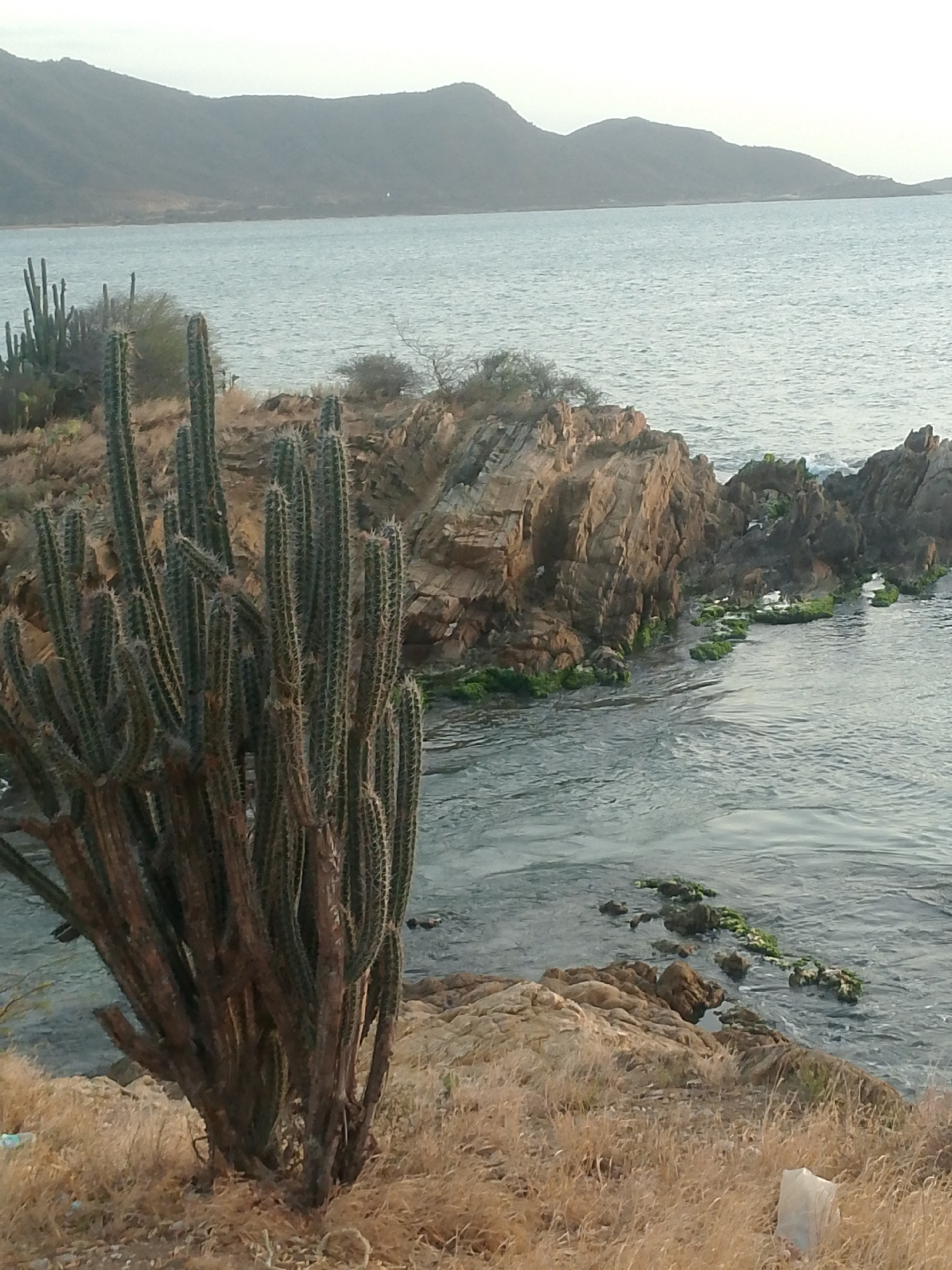 The scene is a coastal landscape in Juan Griego, Venezuela, featuring a cluster of tall, columnar cacti in the foreground. The cacti are multiple stalks originating from a single base, with visible sp…read more