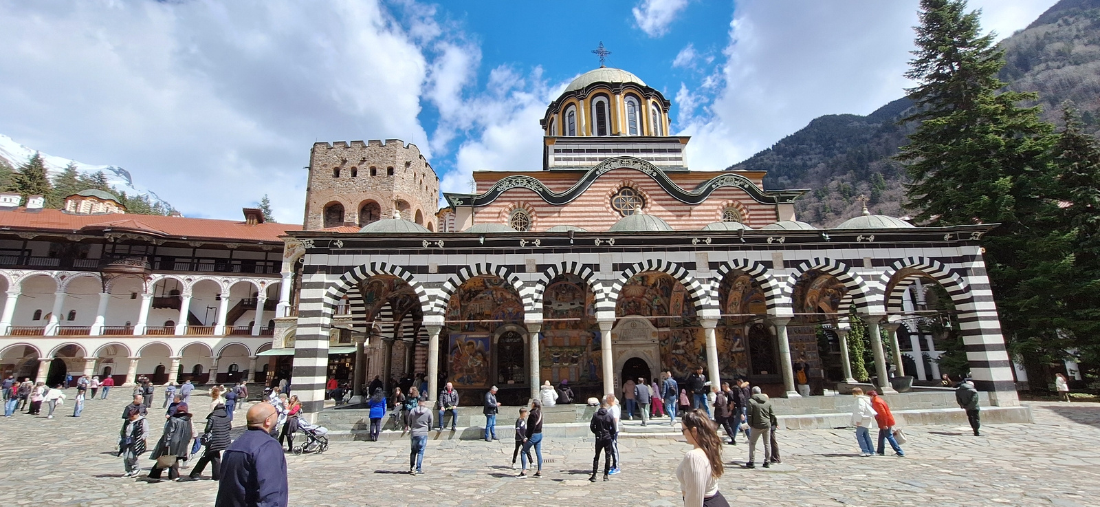 The image shows a courtyard in Rilski manastir, Bulgaria, with a large building featuring black and white striped arches and a central dome topped with a cross. People are milling about in the courtya…read more