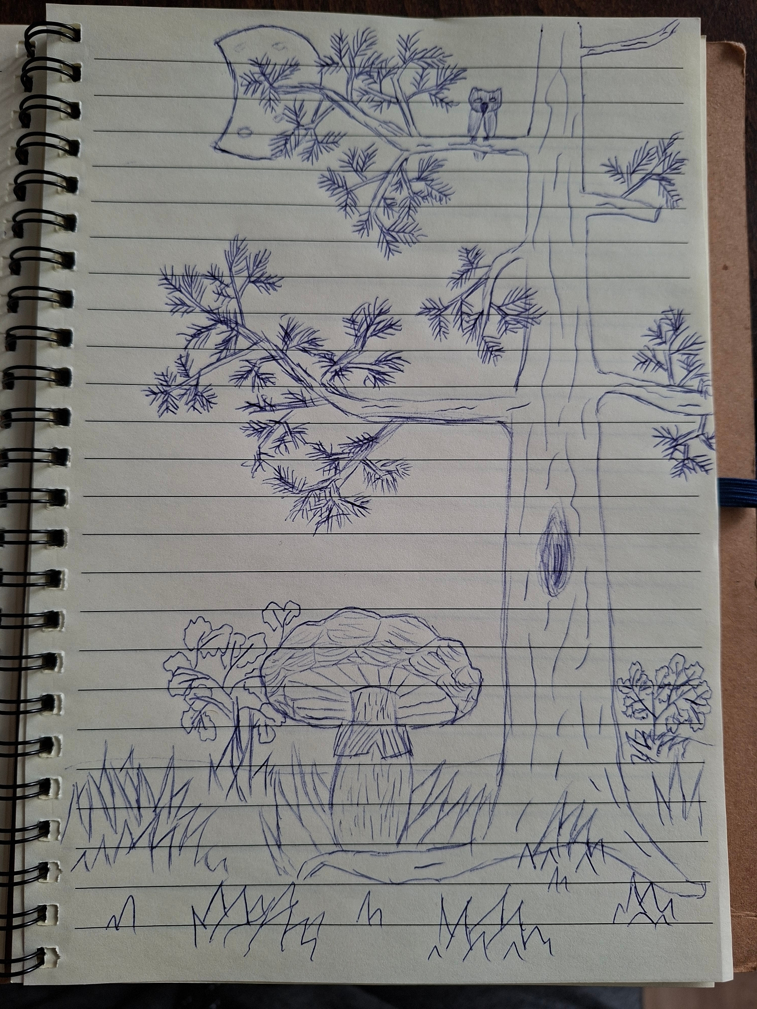 A sketch in blue ink on lined notebook paper shows a tree trunk lying horizontally across the page. The tree has branches with needle-like leaves extending upwards and downwards. A large burl or growt…read more
