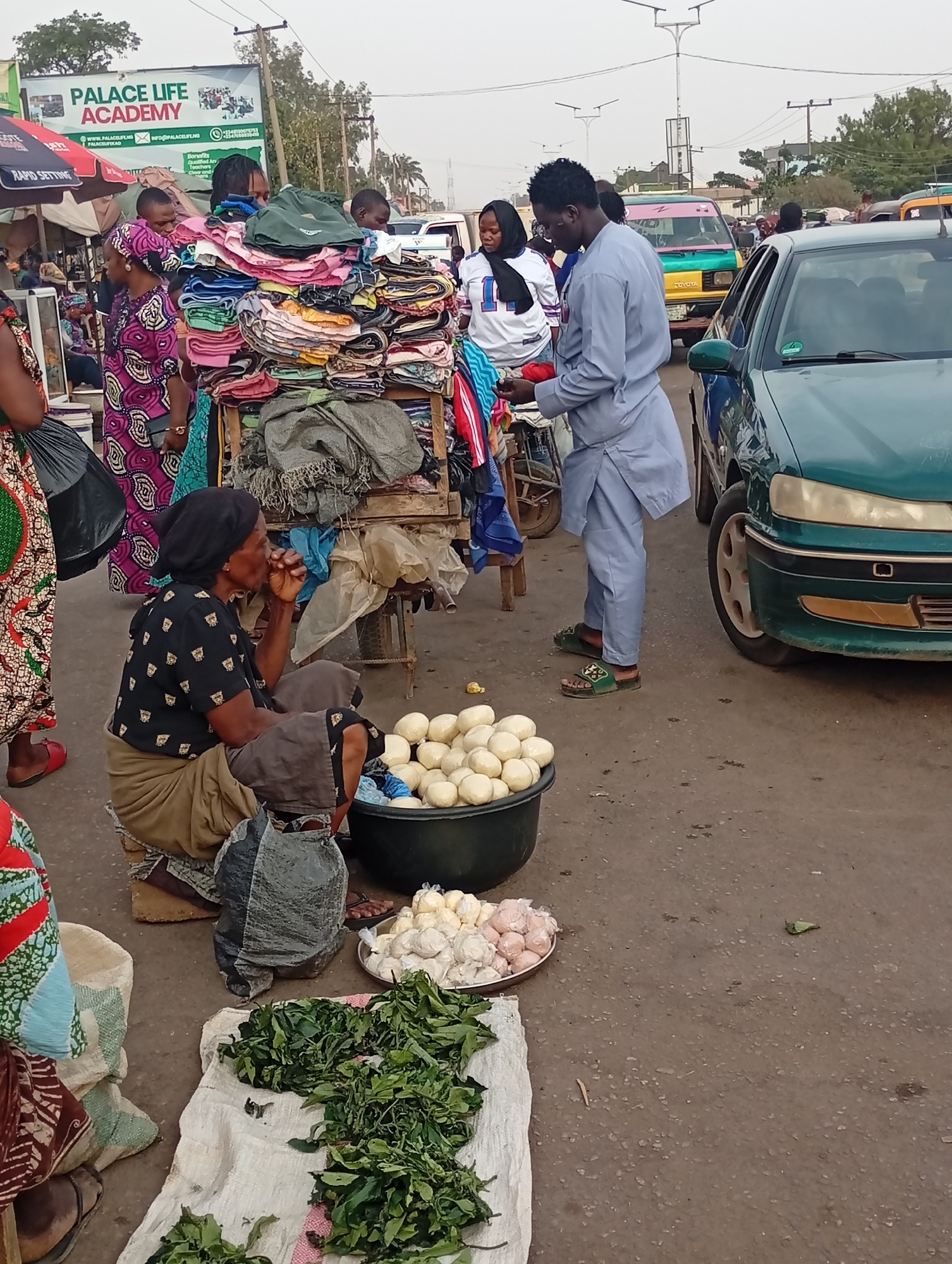 The image shows a street scene in Sabon Tasha, Nigeria. In the foreground, a woman sits on the ground, selling what appears to be doughy balls from a large black bucket and a tray of smaller white bun…read more