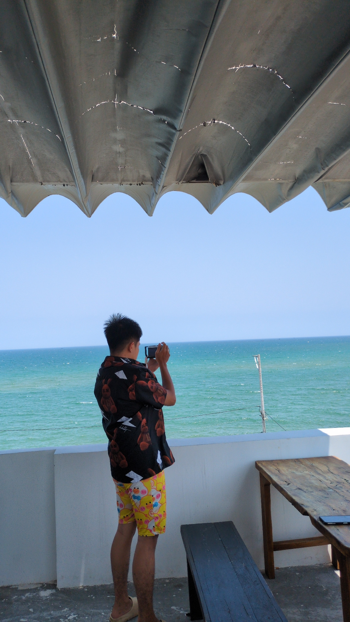 A man stands by the sea in Phan Rang – Tháp Chàm, Vietnam, taking a photo with his smartphone. He is wearing a black shirt with a red rose pattern and yellow shorts with a cartoon pattern. He is also…read more