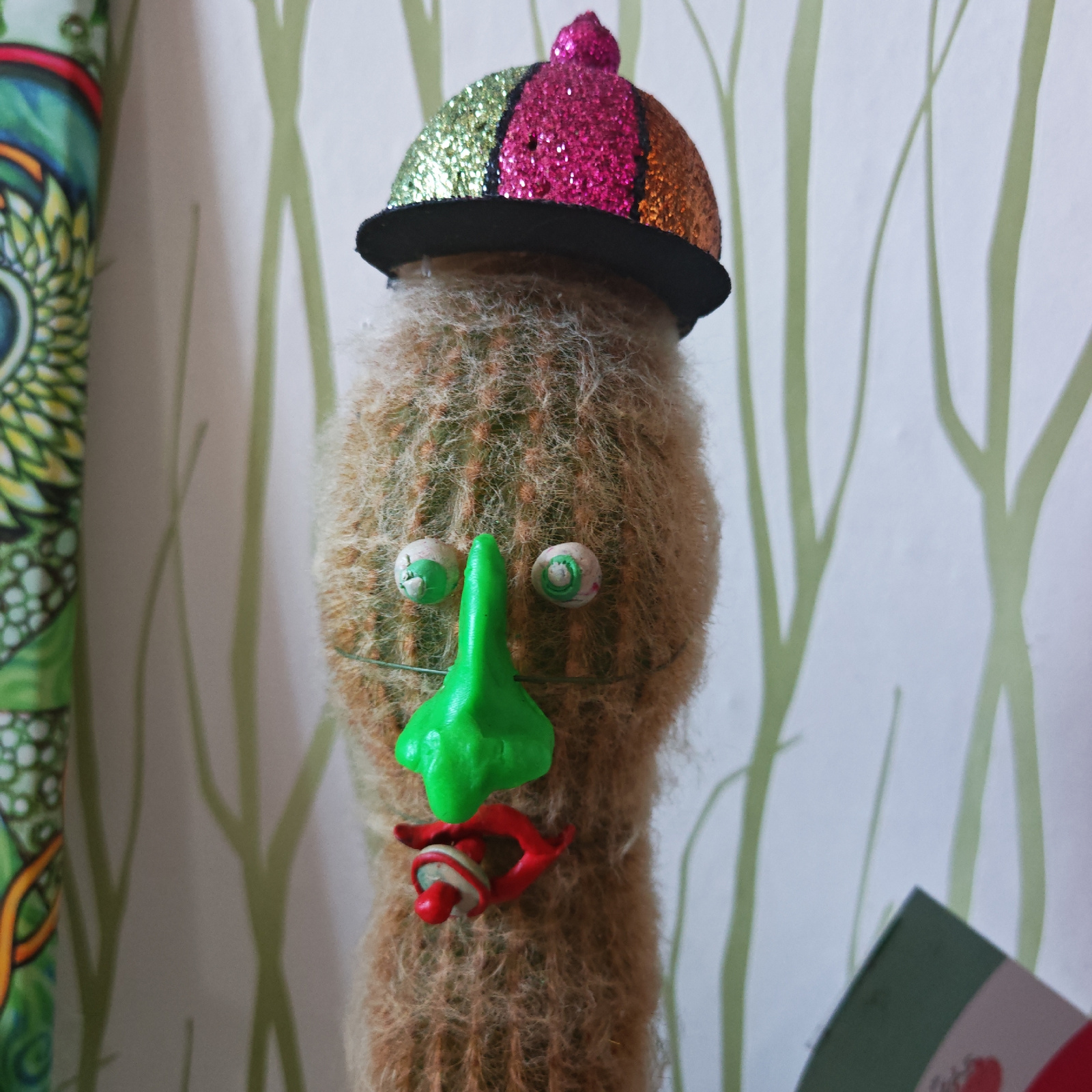 A close-up shows a cactus decorated to look like a comical face with a multicolored, glittery hat on top. The hat is divided into sections of green, pink, and gold glitter. The cactus "face" is formedβ¦read more