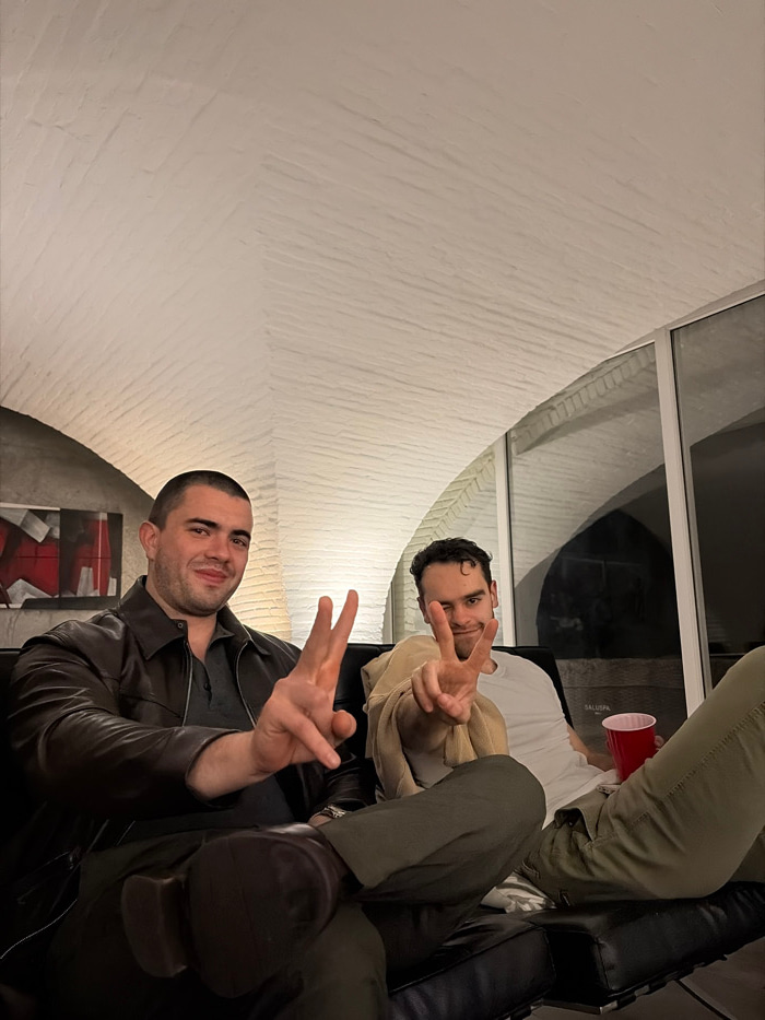 The image displays two adult males seated on a dark leather sofa within an indoor environment in San Bernardino Tlaxcalancingo, Mexico. The room's architecture features a white vaulted ceiling constru…read more
