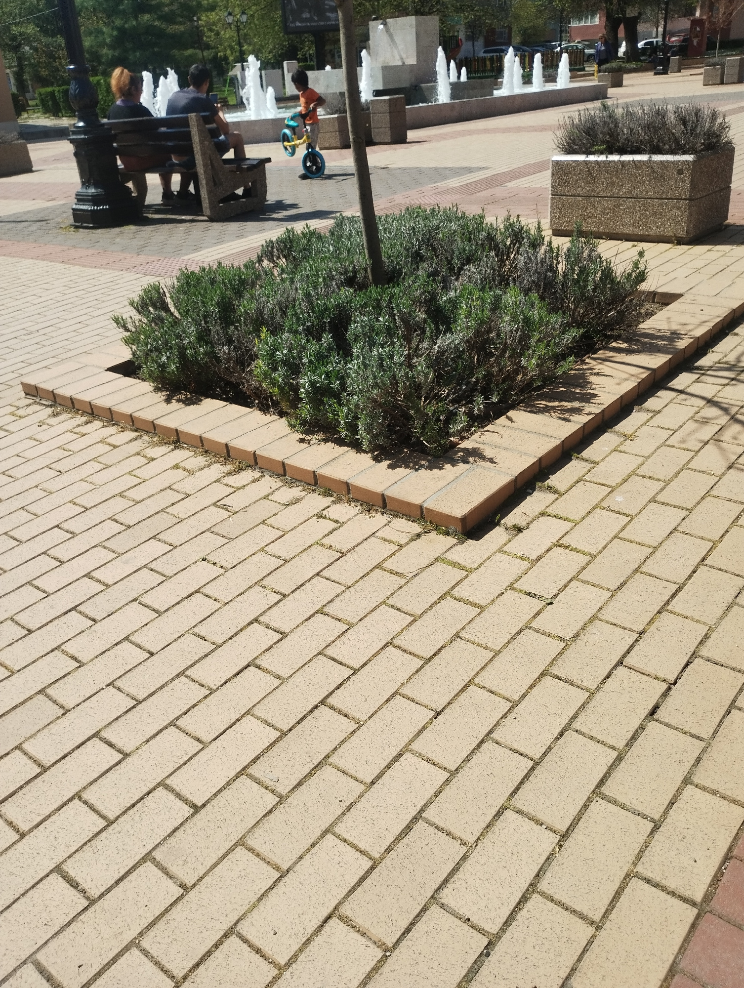 The image depicts a sunlit public square or park in Knezha, Bulgaria, featuring a paved walkway, lush greenery, active water fountains, and people. The dominant element is a broad pedestrian path made…read more