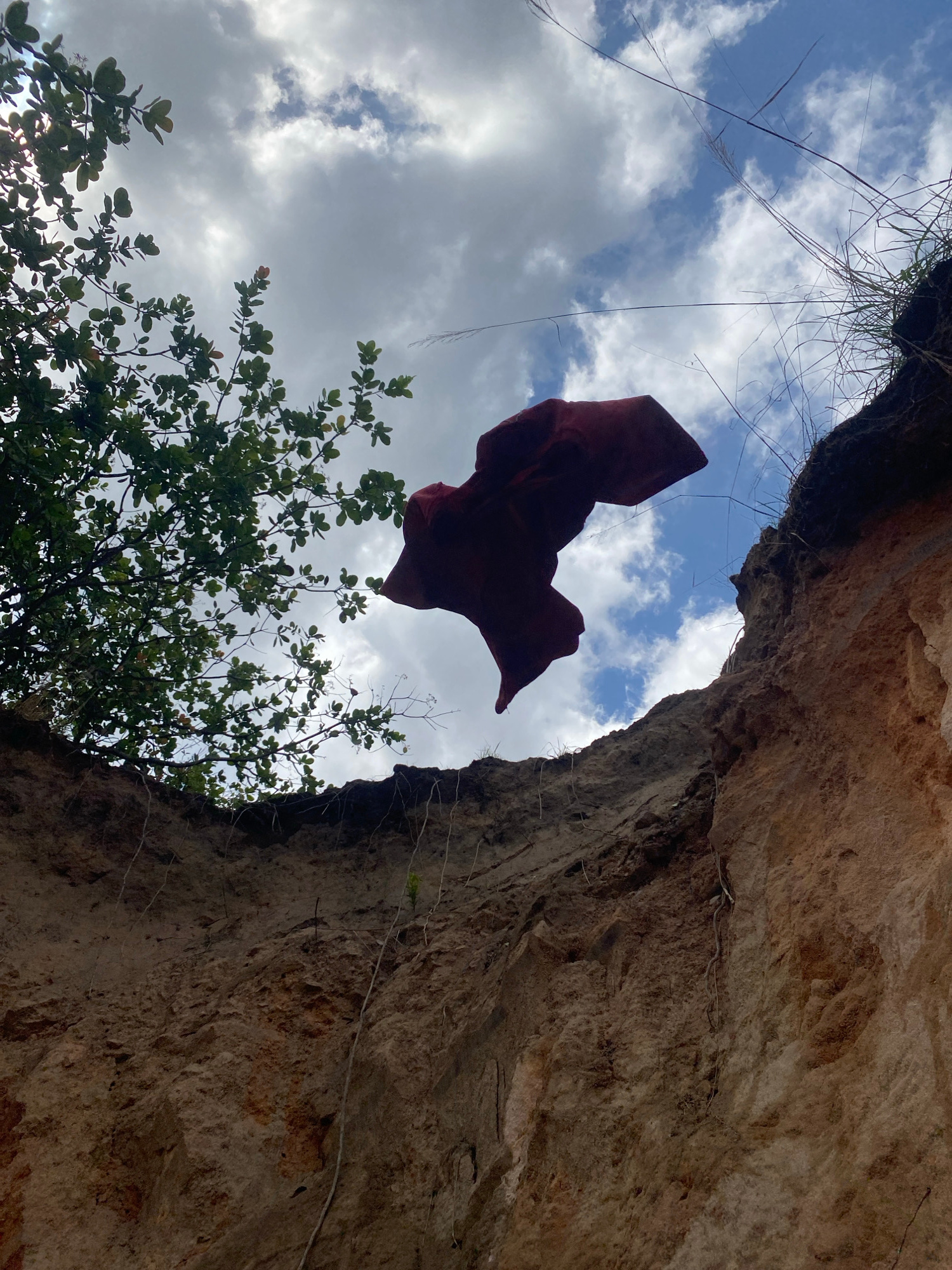 View from below, looking up through a crevice in a rock formation, possibly in the Amaseri, Nigeria area, where such formations are common. A red cloth is suspended mid-air, possibly caught on a tree…read more