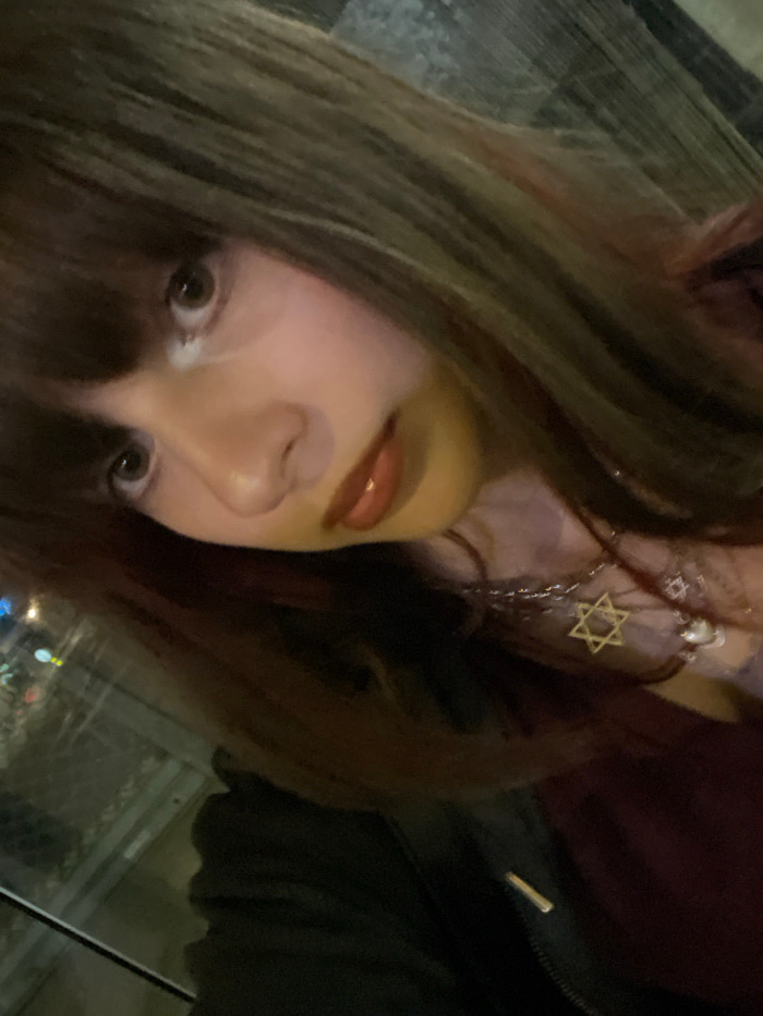A person with dark brown hair framing their face is tilted to the side. They have fair skin, dark eyes, and glossy lips. A silver necklace with a Star of David pendant is visible. The background appea…read more