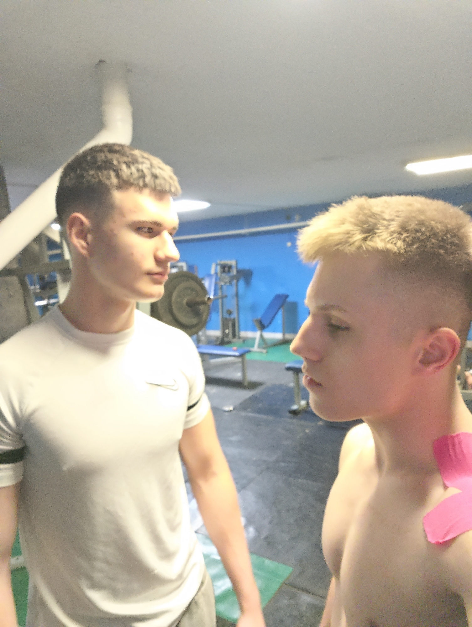 Two young men are facing each other indoors in what appears to be a gym setting. The man on the left is wearing a light-colored t-shirt with dark stripes on the sleeves. The man on the right is shirtl…read more