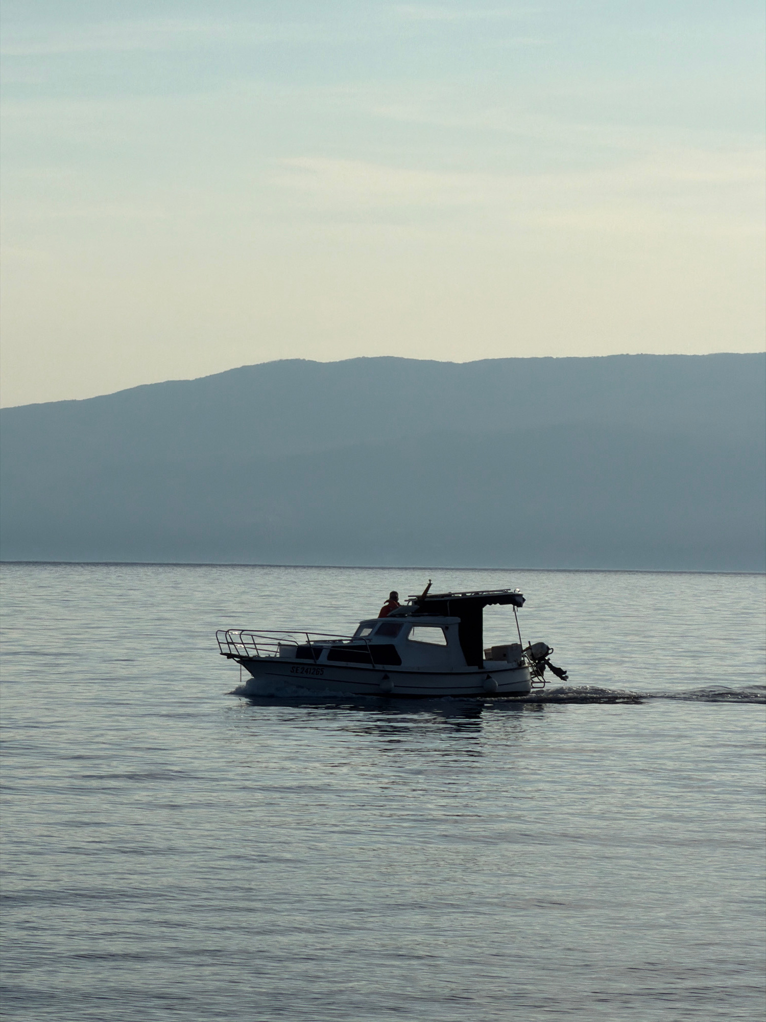 A slightly out-of-focus, horizontally oriented image shows a boat underway near the city of Grad Rijeka, Croatia. The mountain on the left side indicates the image was taken along the Kvarner Gulf. Th…read more