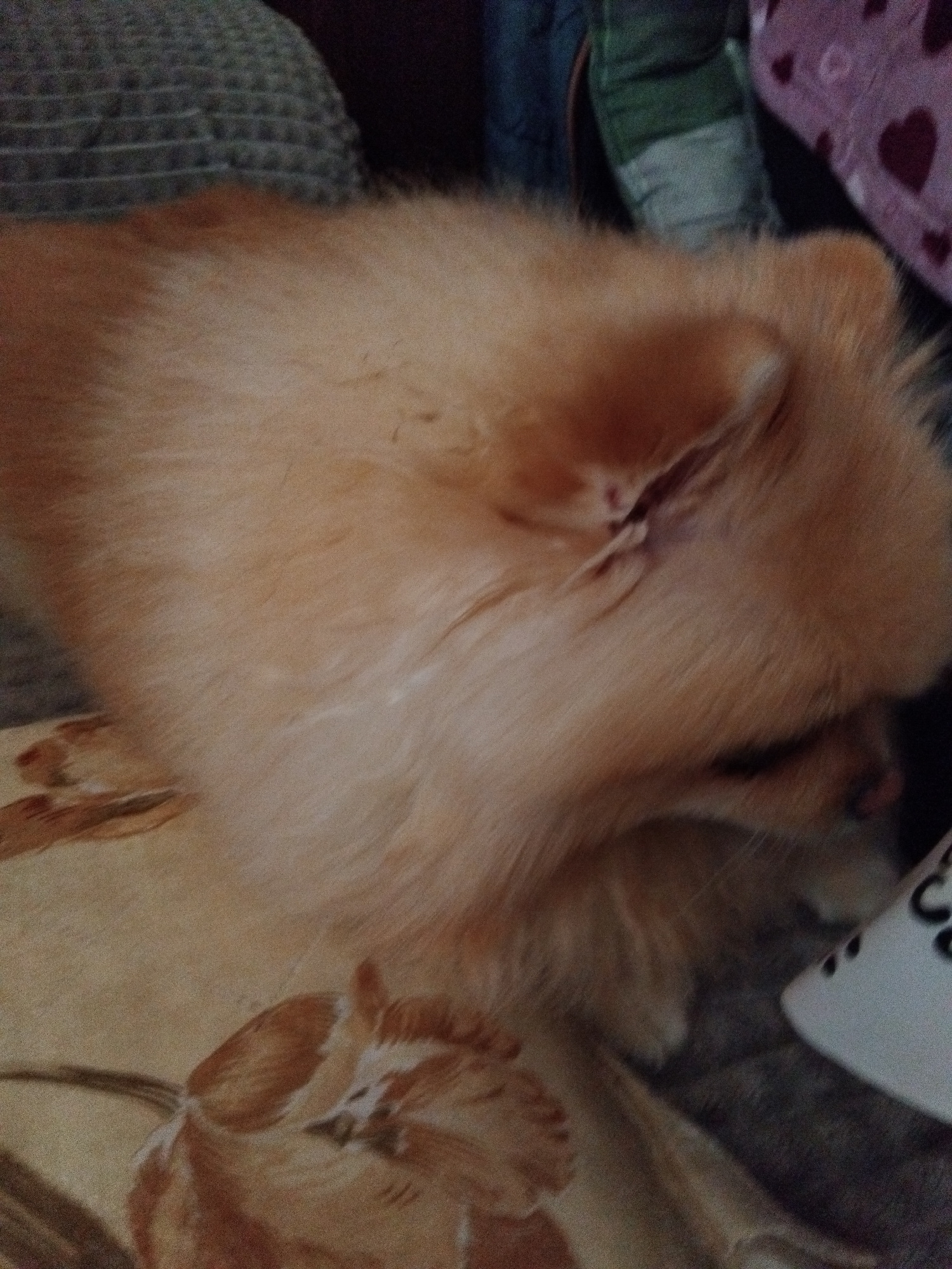 A close-up, soft-focus shot shows a ginger cat lying on a cushion with a floral pattern. Part of the cat's ear is visible. To the left are a patterned blanket and a dark object. The photo appears to b…read more