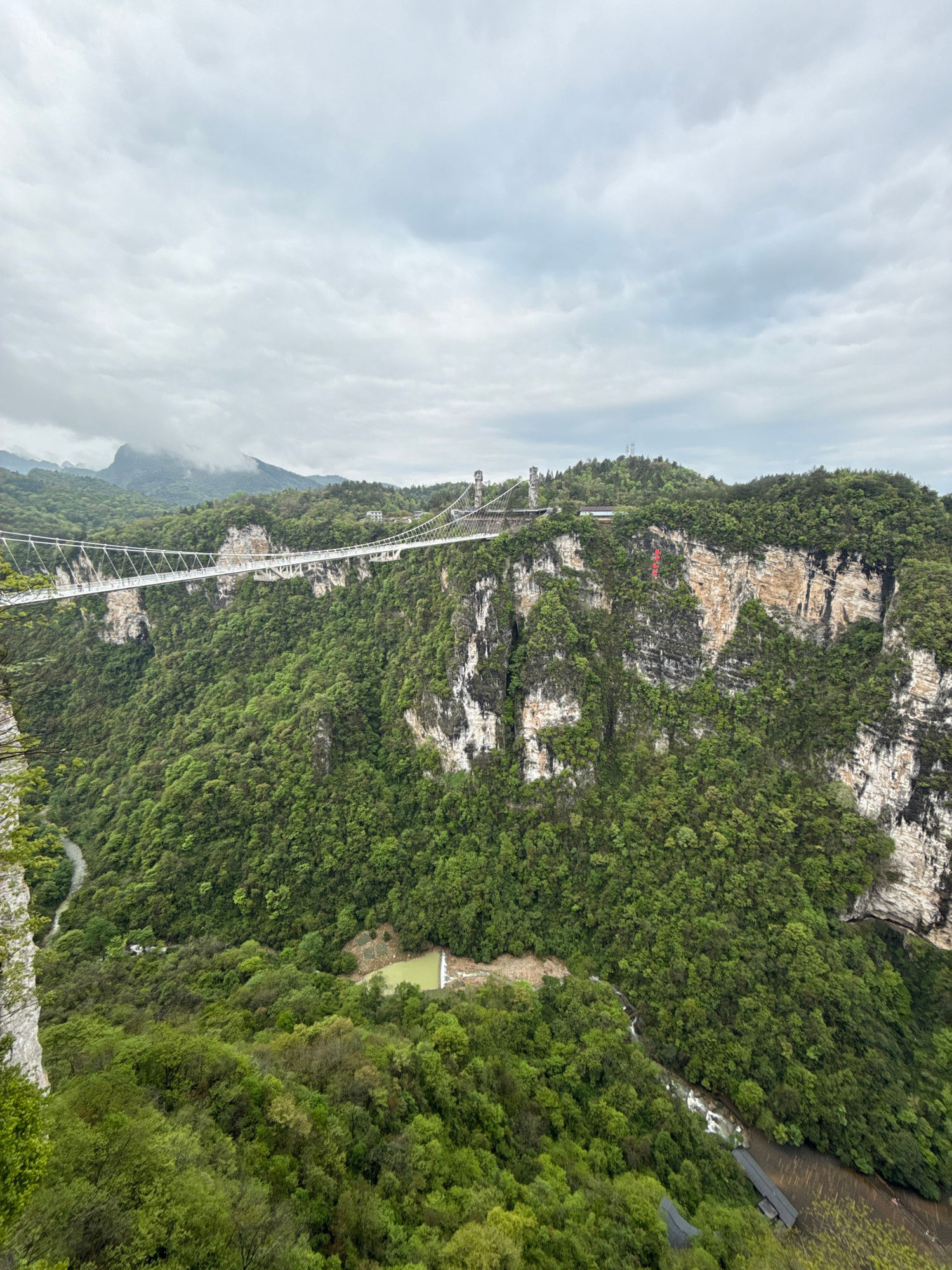 The image captures a long, narrow, glass-bottomed bridge spanning a deep, green, forested gorge. The bridge is supported by white cables and towers, connecting two steep, rocky cliffs covered in dense…read more
