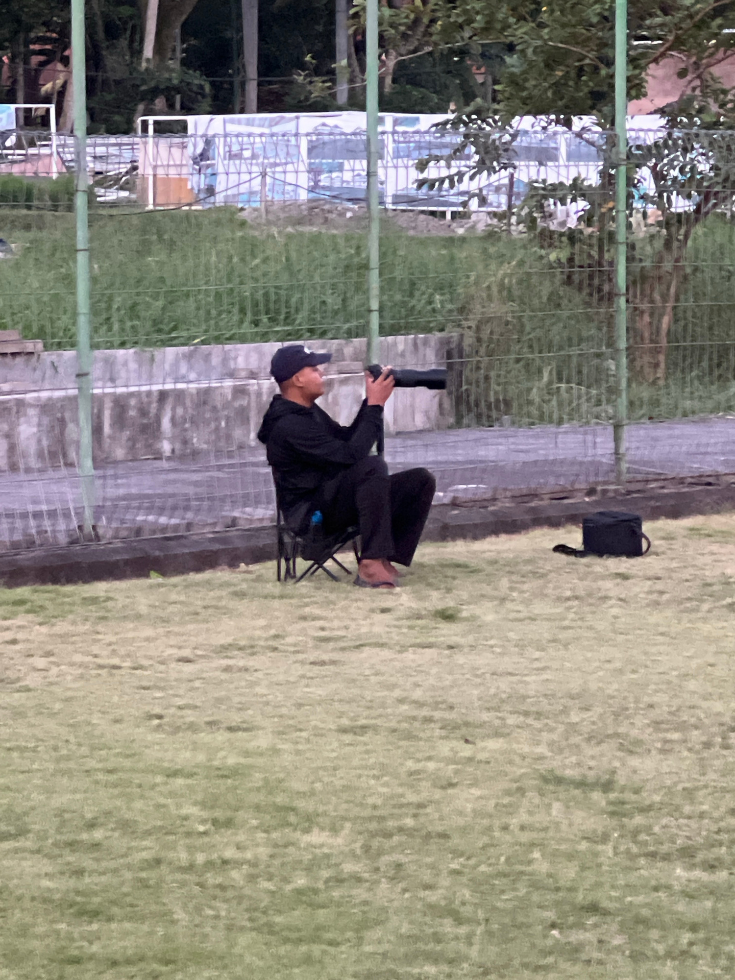 A man in black attire and a cap sits in a folding chair on a grassy area. He appears to be looking through binoculars or a similar device. A black bag sits beside him. A concrete wall and a green wire…read more