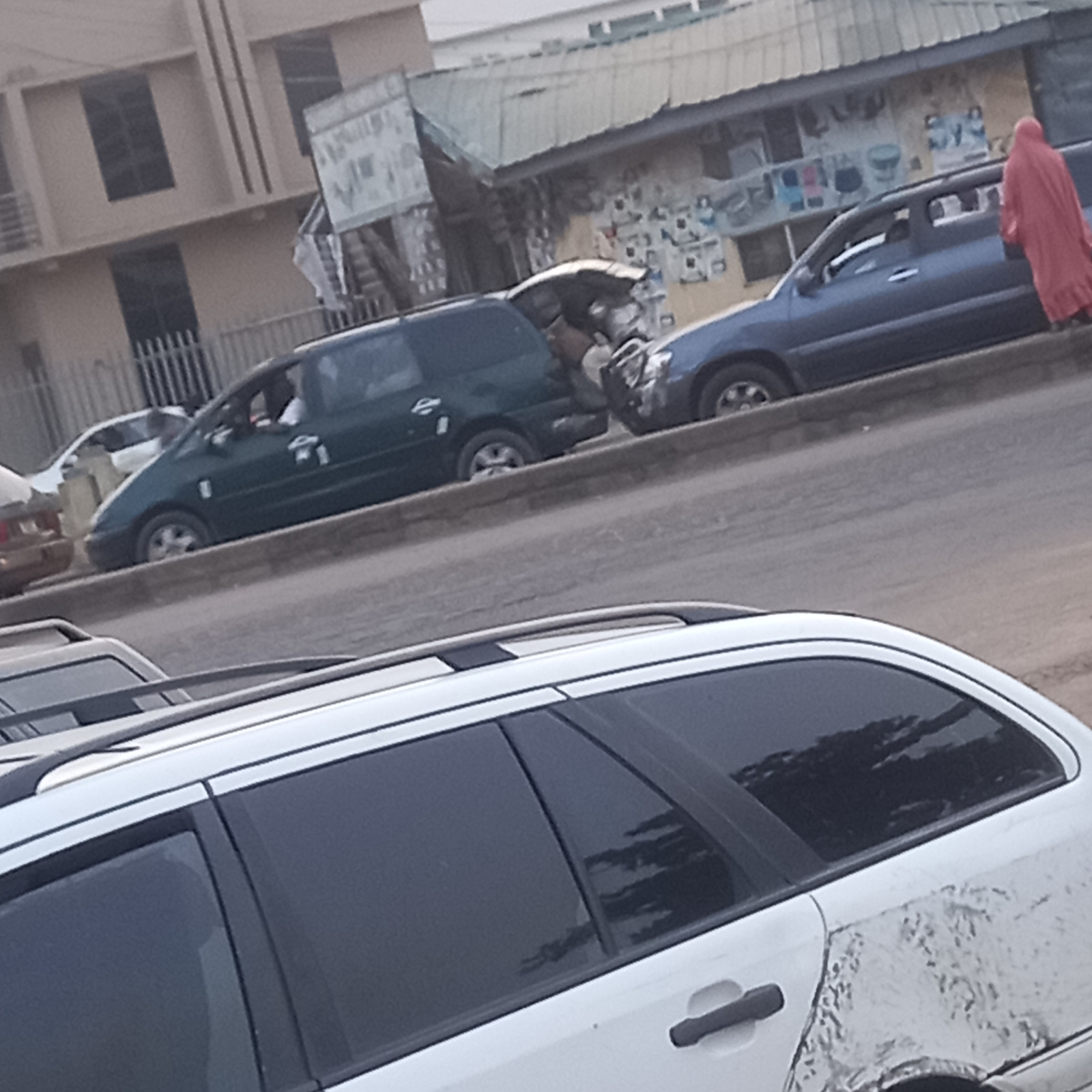The image depicts a street in Dadi Riba, Nigeria, featuring several parked cars. A white vehicle is prominently visible on the right side of the frame, with a partially damaged roof. Adjacent to it, a…read more