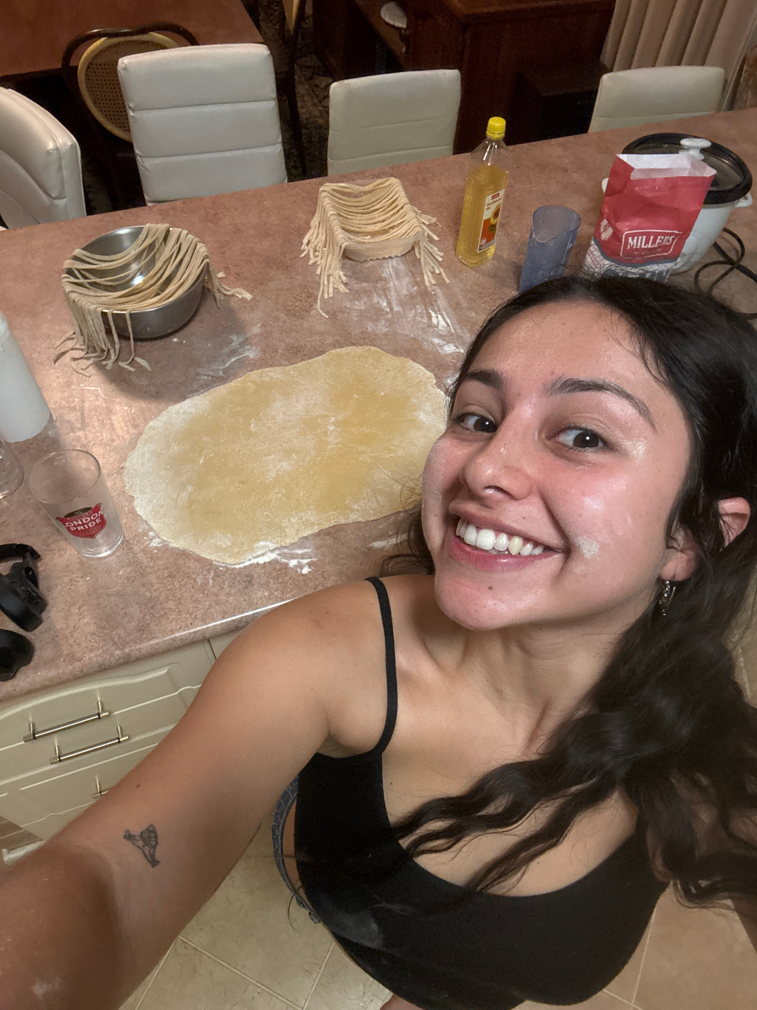 A young woman is taking a selfie while preparing pasta dough on a kitchen countertop. The countertop has a brown textured surface. There is a flattened, rectangular piece of pasta dough covered in flo…read more