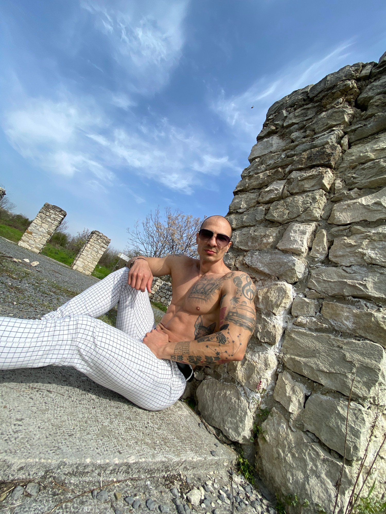 A shirtless man wearing white checkered trousers and sunglasses is leaning against a stone wall. He has numerous tattoos on his arms and torso. He is sitting on a concrete structure. In the background…read more