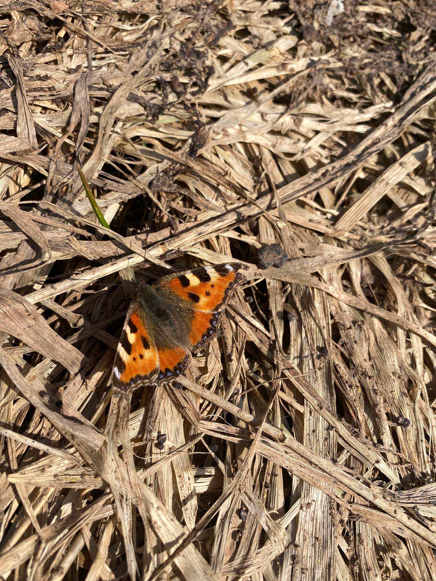 A vibrant Small Tortoiseshell butterfly (Aglais urticae) rests on a bed of dry, interwoven straw-like plant material in a close-up outdoor scene. The butterfly is positioned slightly to the right of t…read more