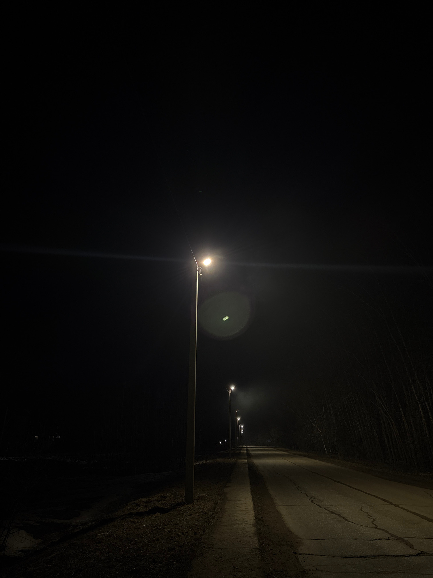 The image shows a nighttime scene of a dark road illuminated by a series of streetlights. The road surface appears cracked and aged. The background is obscured by darkness and possible fog or mist. Th…read more