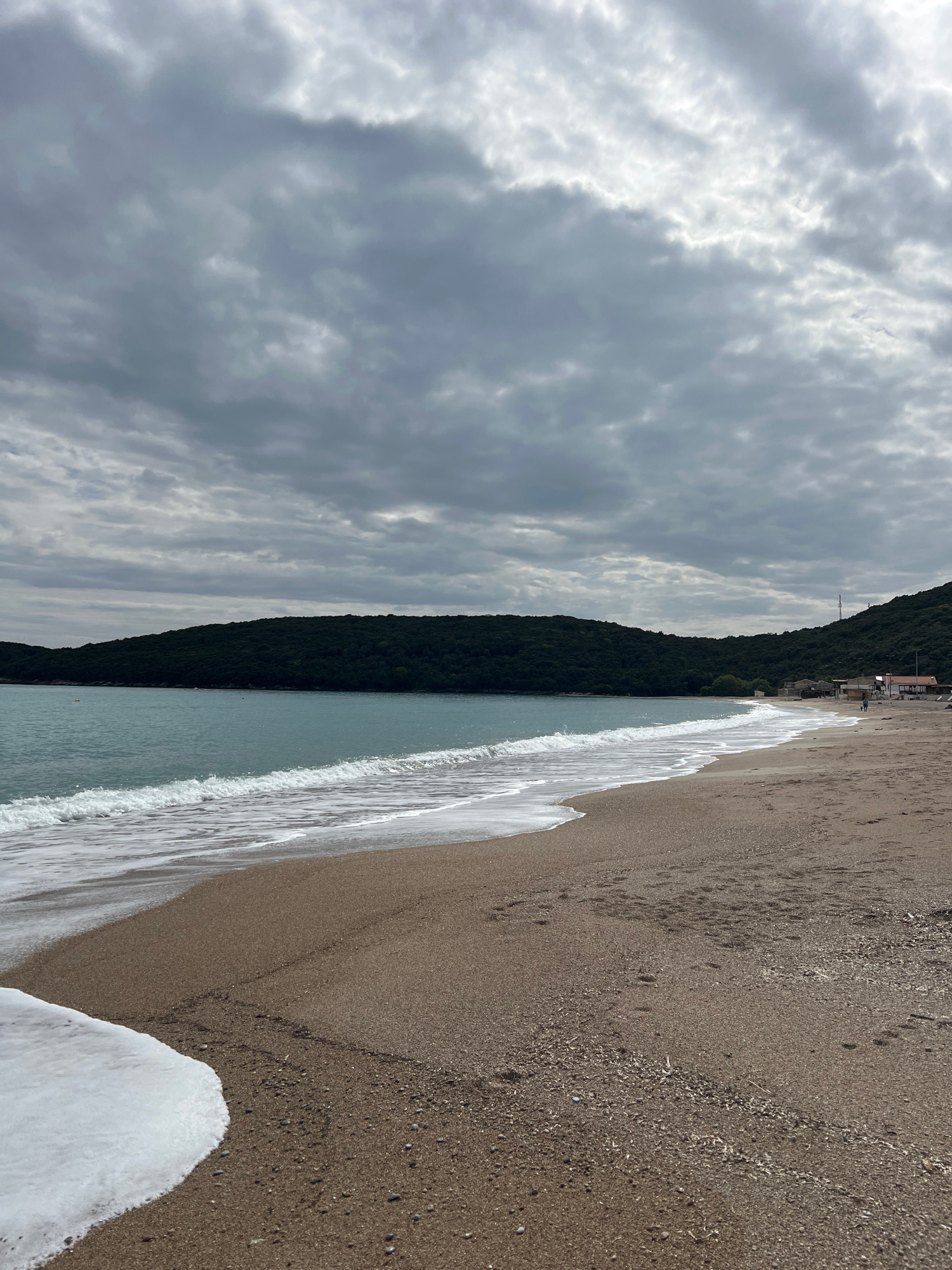 The photograph shows a beach in Prijevor, Montenegro on an overcast day. The shoreline runs diagonally across the frame, with a dark, forested hillside along the left edge. A small cluster of building…read more