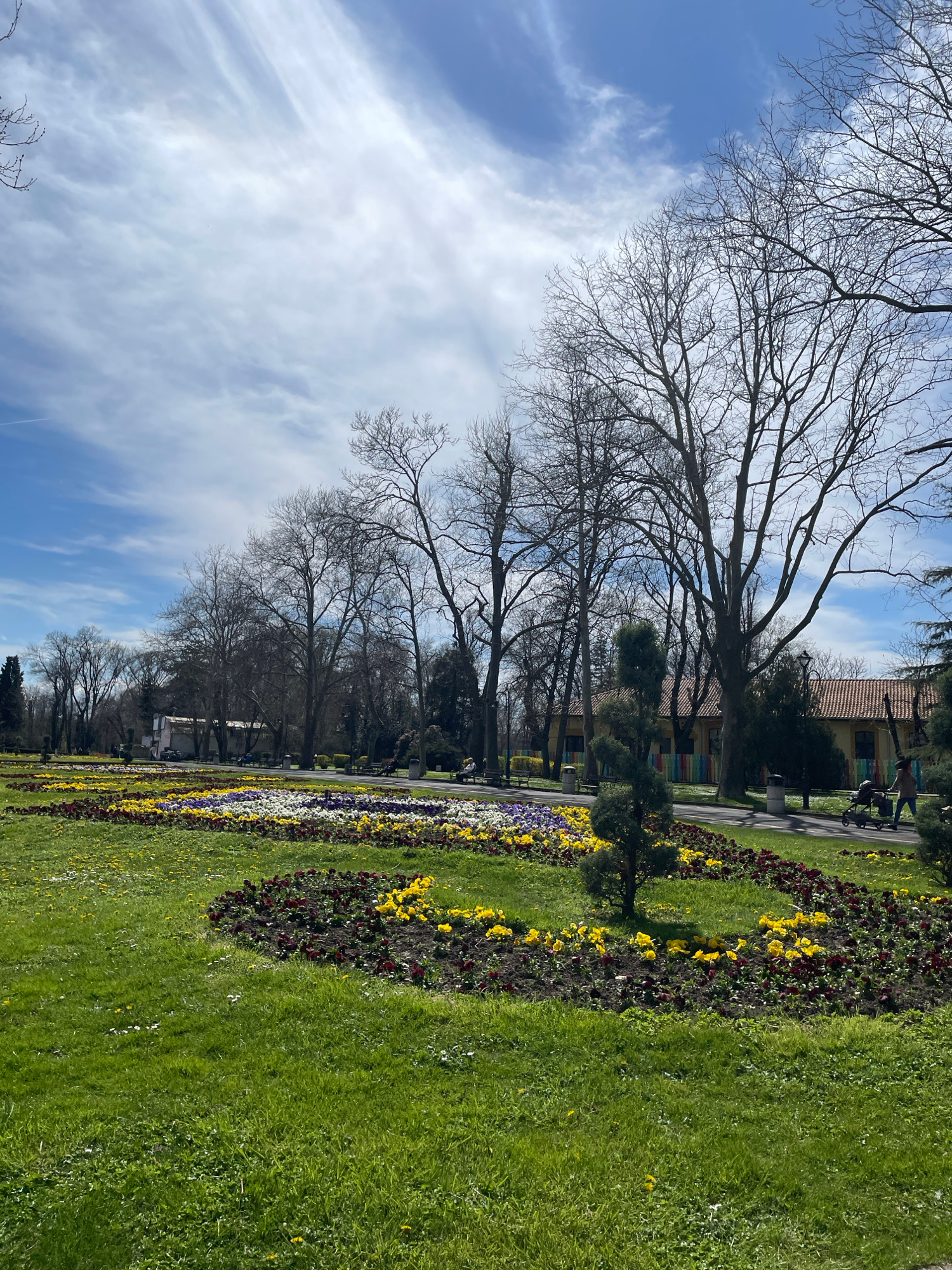 The image depicts a park in Burgas, Bulgaria, characterized by a flowerbed displaying a pattern of yellow, red, white, and purple flowers. Adjacent to the flowerbed is a stretch of green grass. A pave…read more