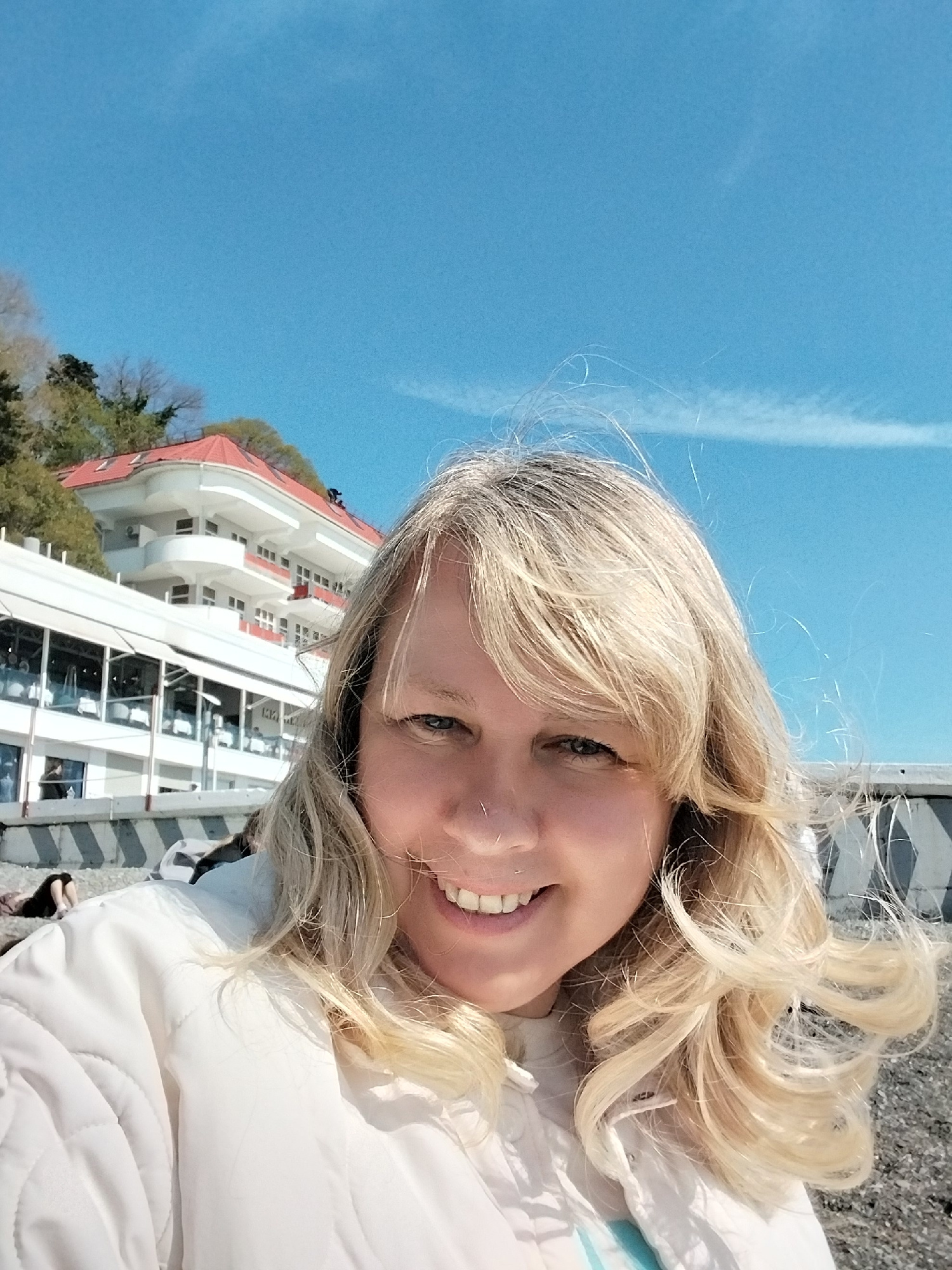 A close-up, rotated portrait captures a smiling woman with long, wavy blonde hair, looking directly at the camera. The image is oriented sideways, with the woman's head tilted towards the bottom left.…read more