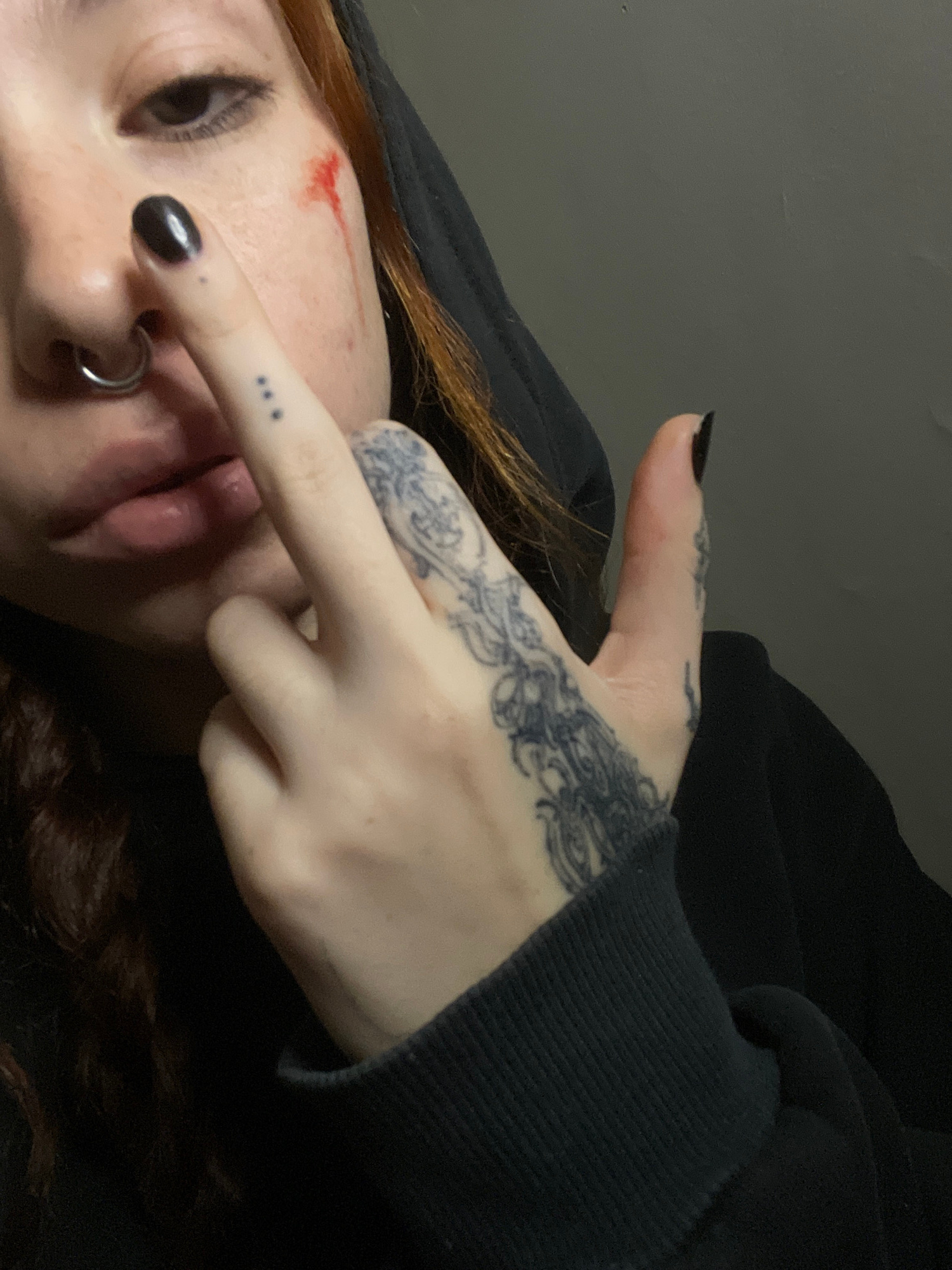 A close-up, angled shot depicts a person lying down with visible injuries, including a cut on their forehead. The person has a nose ring, and their skin is fair. Their hair appears to be reddish-brown…read more