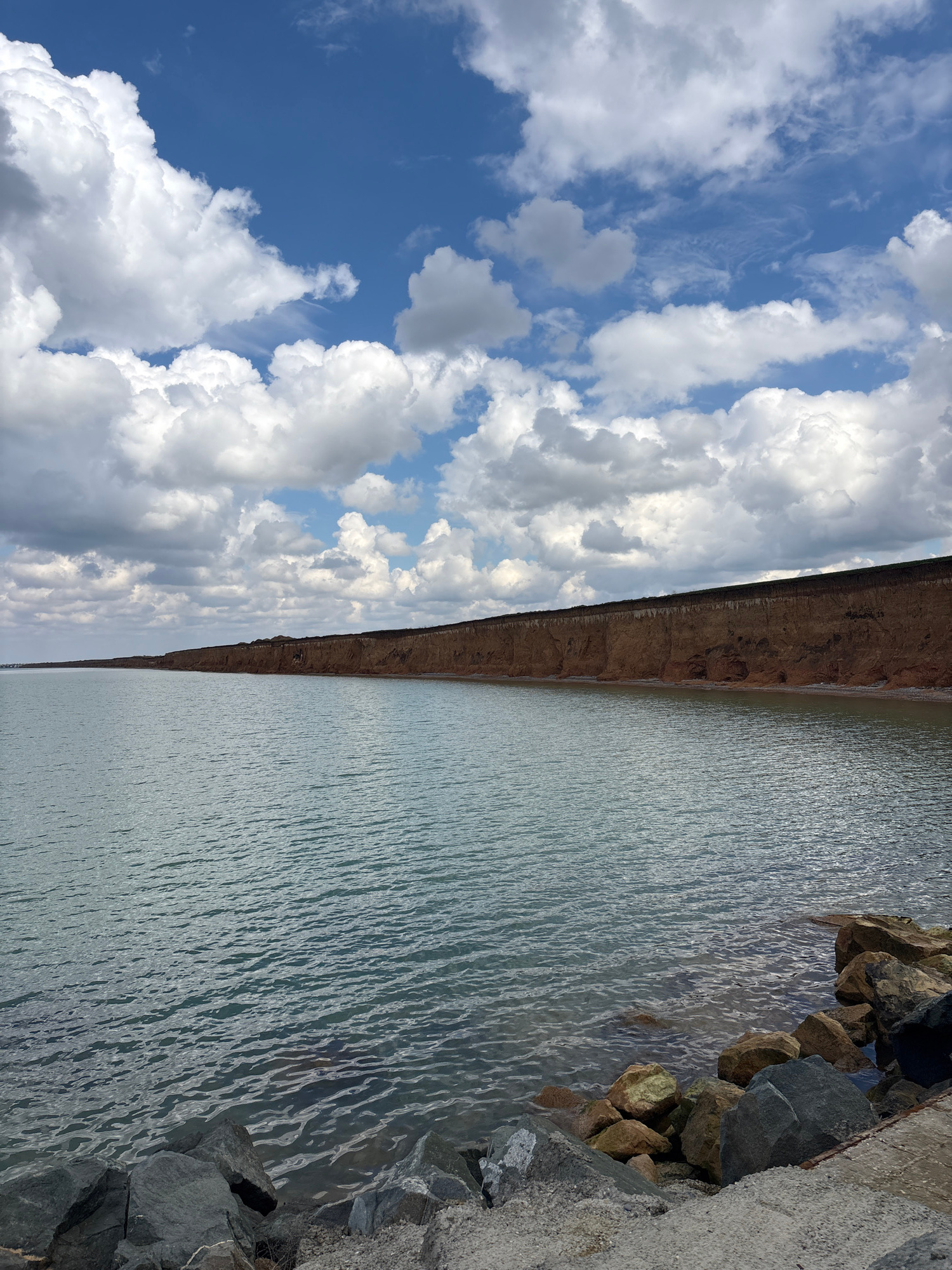 The image shows a water body, possibly a lake or river, on the right side and a sky with clouds on the left side. A strip of land runs between the water and sky. The right edge of the image shows larg…read more