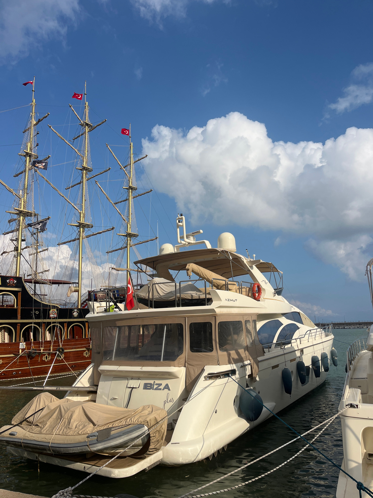 The image shows two boats moored side-by-side in what appears to be the city of Alanya, Turkey, based on the flags displayed. On the right, a modern, white motor yacht is docked. The yacht has a beig…read more