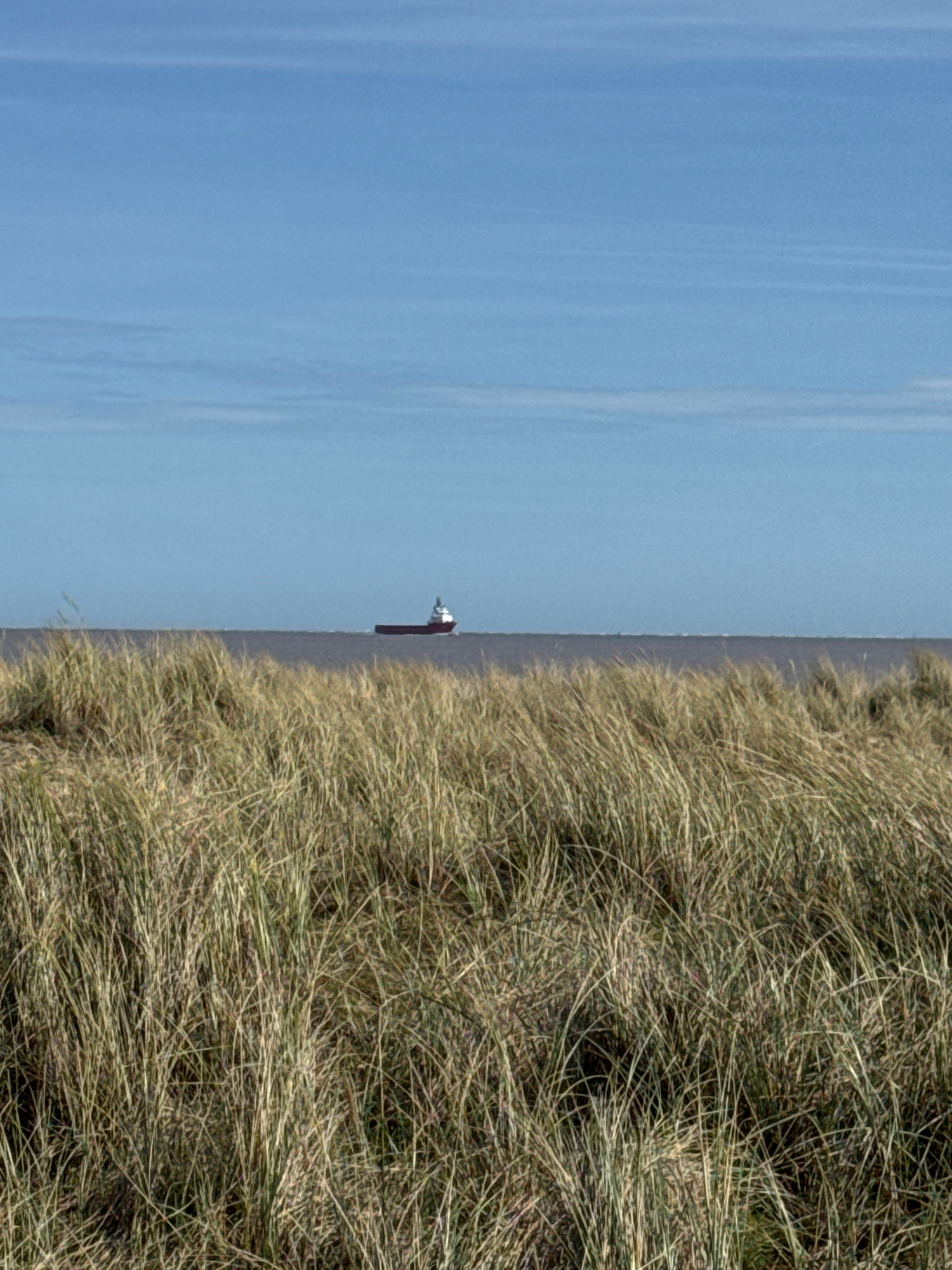 A landscape photograph taken on a sunny day in Gorleston-on-Sea, United Kingdom. The composition is vertically oriented, with the left third showing a clear blue sky with subtle cloud streaks. The mid…read more
