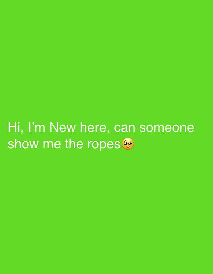 The image is a green background with the text "Hi, I'm New here, can someone show me the ropes🥺". There is no indication of location.