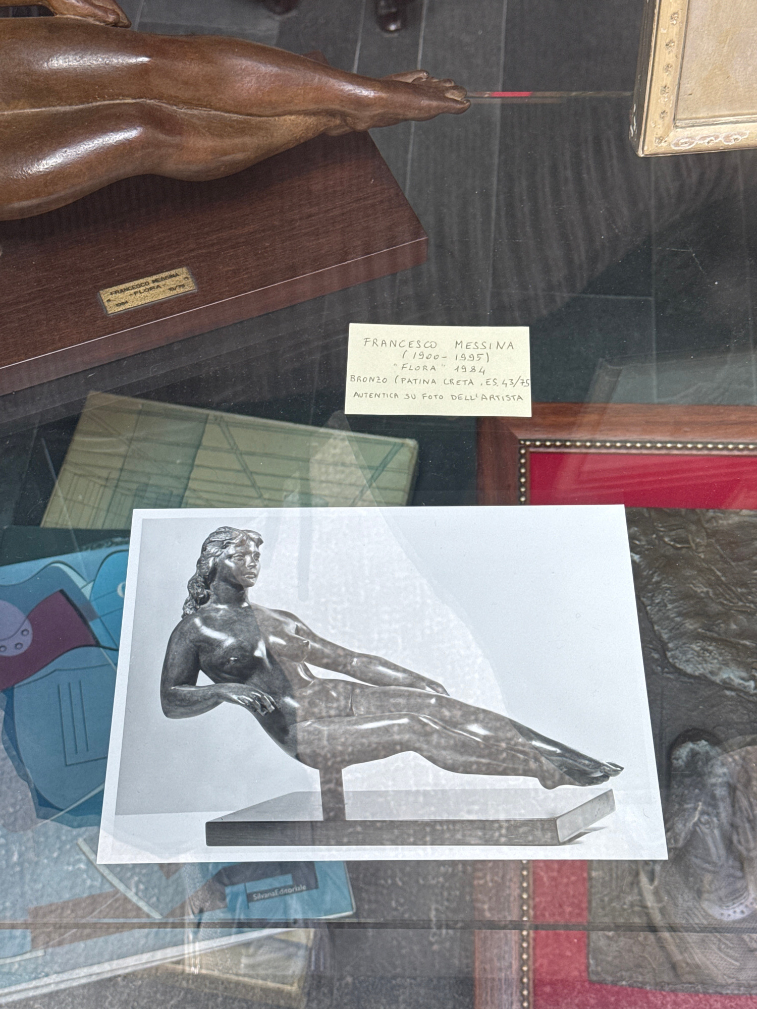 The image captures an art display behind a glass surface, likely in a gallery or shop. The primary subject is a printed photograph of a bronze sculpture by Francesco Messina. The sculpture, titled "Fl…read more