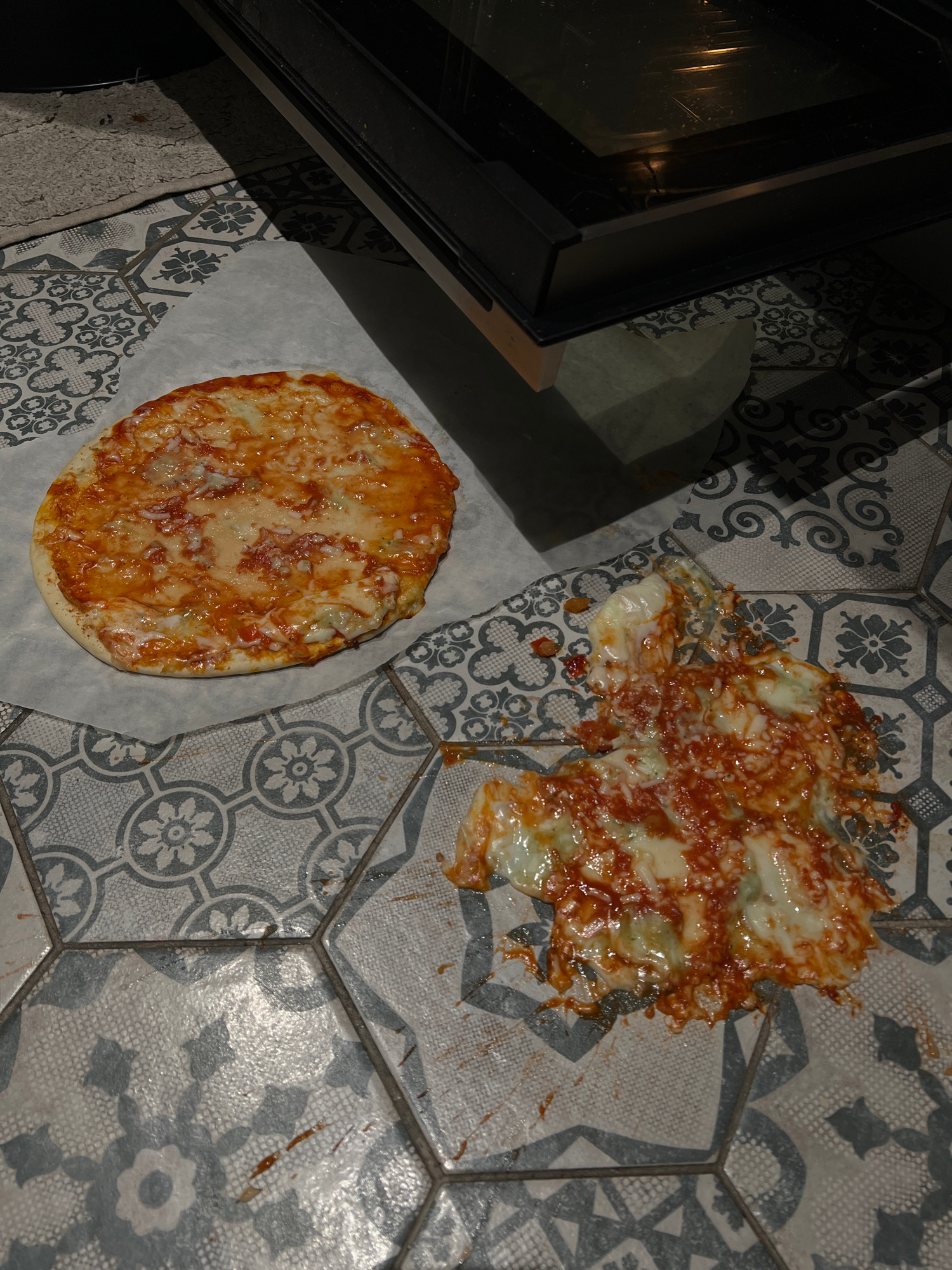 In a domestic setting in Khimki, Russia, a kitchen floor with hexagonal grey and white patterned tiles is depicted. On the left, an unbaked or partially baked pizza, approximately 20-25 cm in diameter…read more