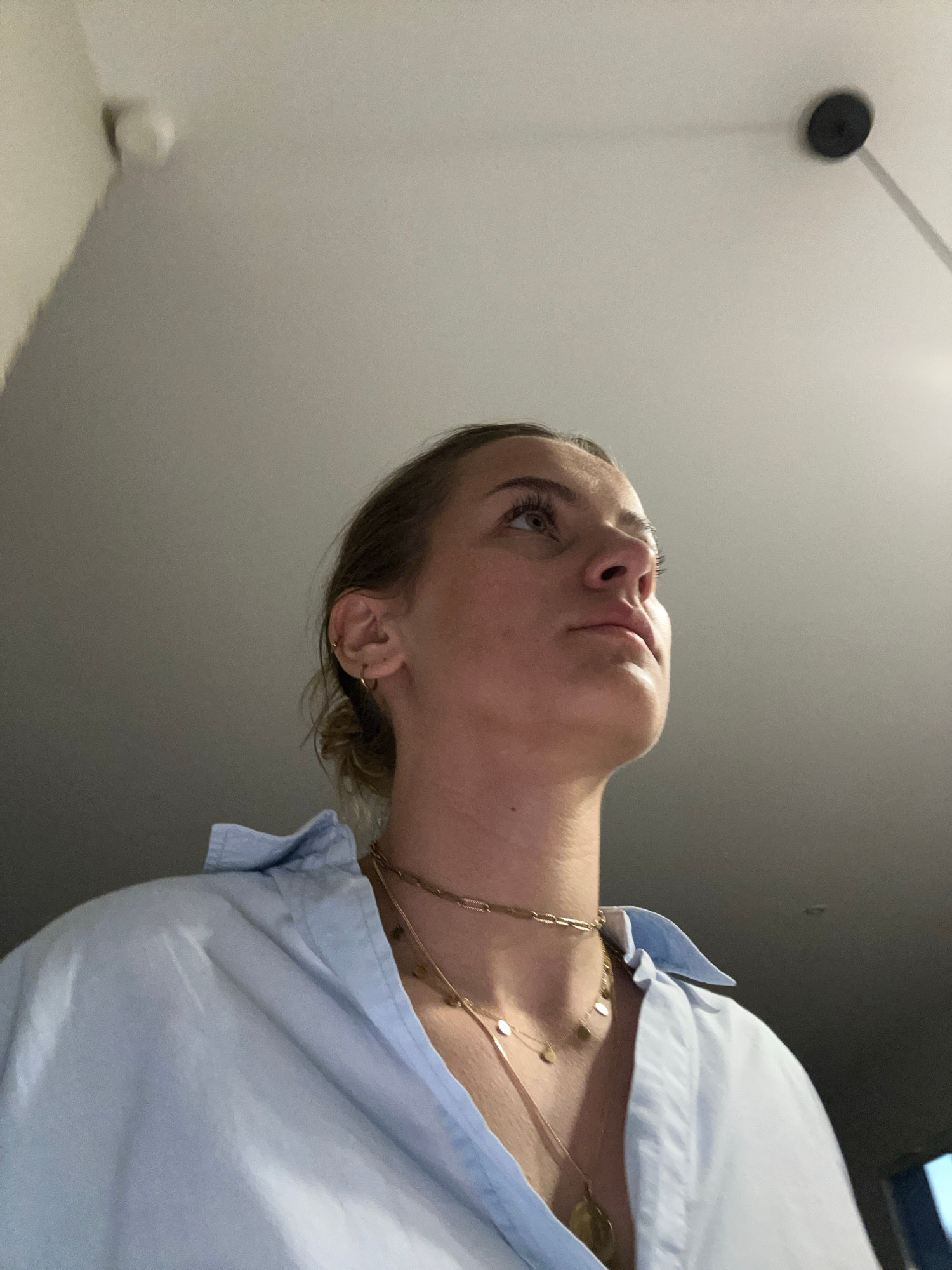 A low-angle shot of a person in Veauchette, France, wearing a light blue button-down shirt and gold necklaces. Their head is tilted back, with their face and neck visible. The background is a blurry w…read more