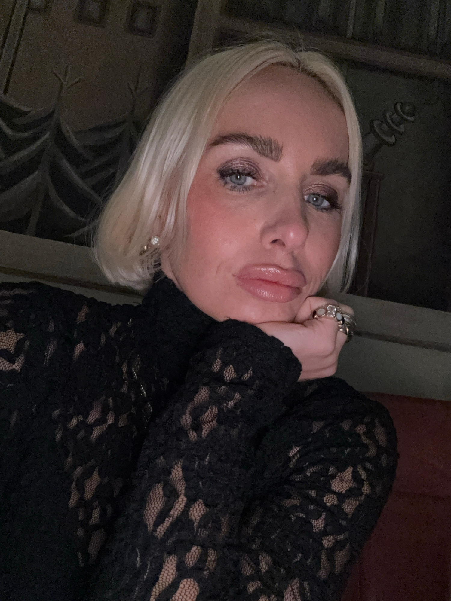 A light-skinned woman with short, blonde hair is the subject of this close-up photograph. She is wearing a black, high-necked, lace-patterned garment. She is wearing rings on her left hand, which is p…read more