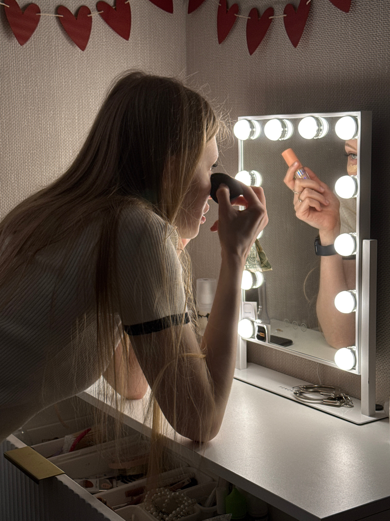 A woman with long blonde hair applies makeup in front of a lighted vanity mirror. She holds a makeup sponge near her face. The reflection in the mirror shows her other hand holding a tube of makeup. T…read more