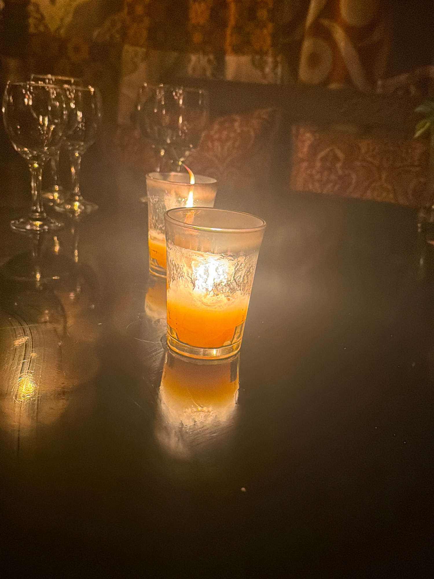 A close-up shot shows a lit candle inside a textured glass holder, reflected on a dark, possibly varnished surface. The background contains blurred elements suggesting a room setting with patterned fa…read more
