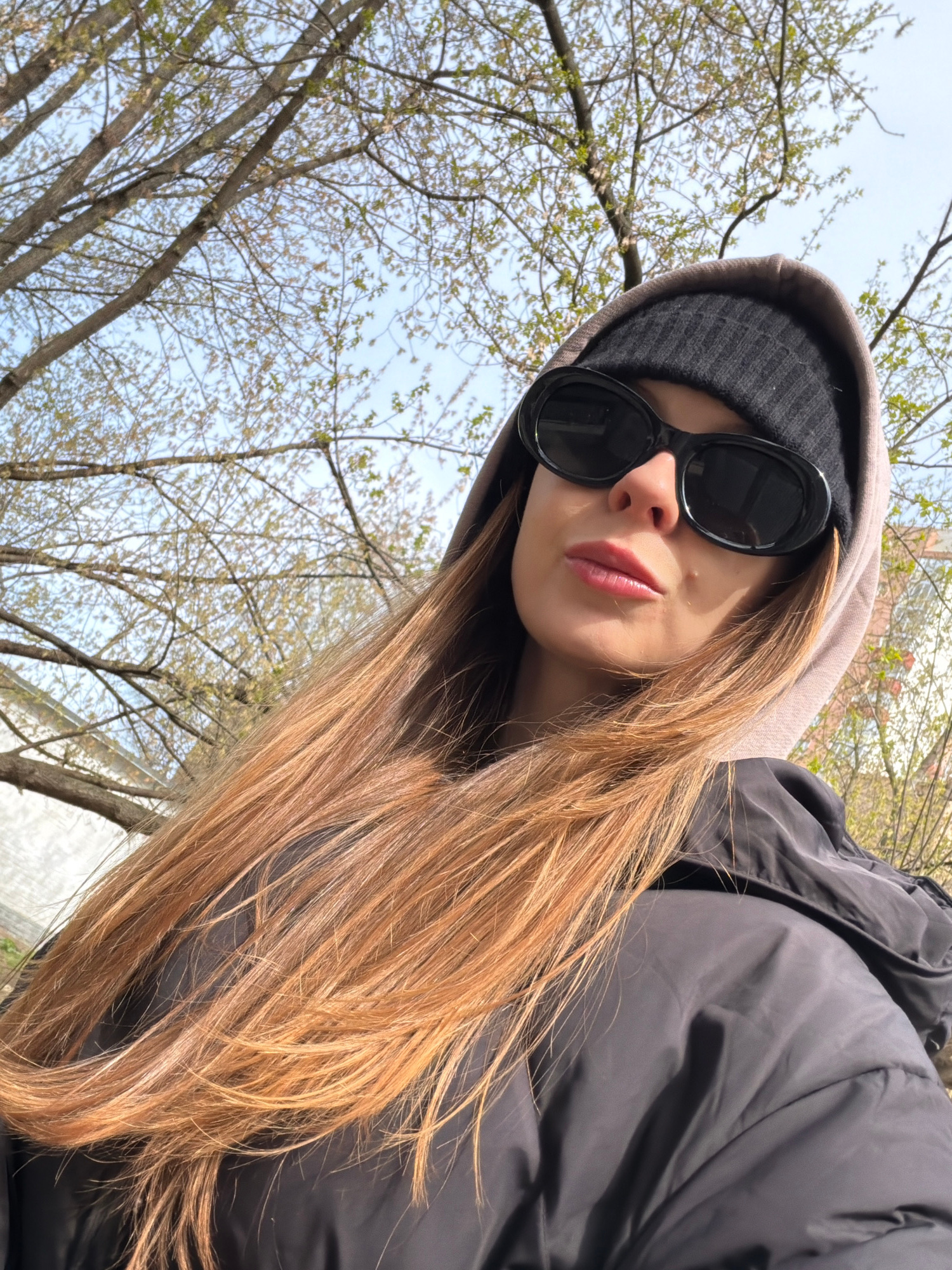 A young person is captured in a close-up, low-angle self-portrait, looking downwards towards the camera. The subject's face is partially obscured by dark, oval-shaped sunglasses and a black knitted be…read more